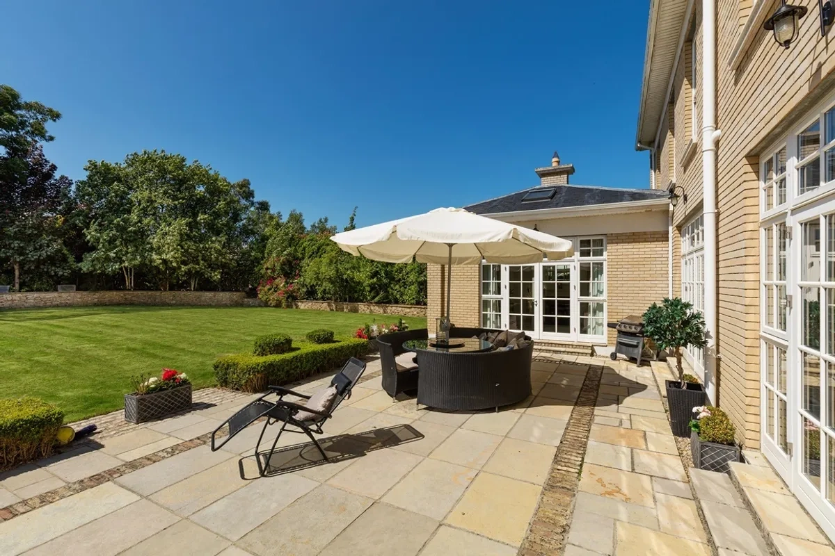 To the side there is a large gravel area and to the rear the sunny west facing garden features an extensive Indian sandstone patio leading to a manicured lawn bounded by mature trees and stone clad walls. The private rear garden enjoys a sunny westerly orientation where one can relax late into the evening.