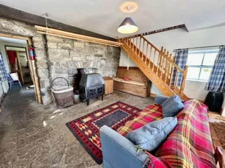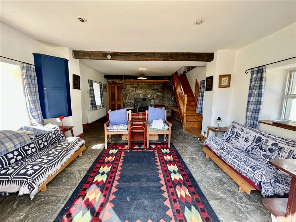 A short path leads up to the property with a partial stone wall on one side. A stone fireplace and exposed ceiling beam are amongst the most distinctive features in the sitting room. Patio doors connect this space with the patio outdoor while wooden stairs lead upstairs to the first floor.