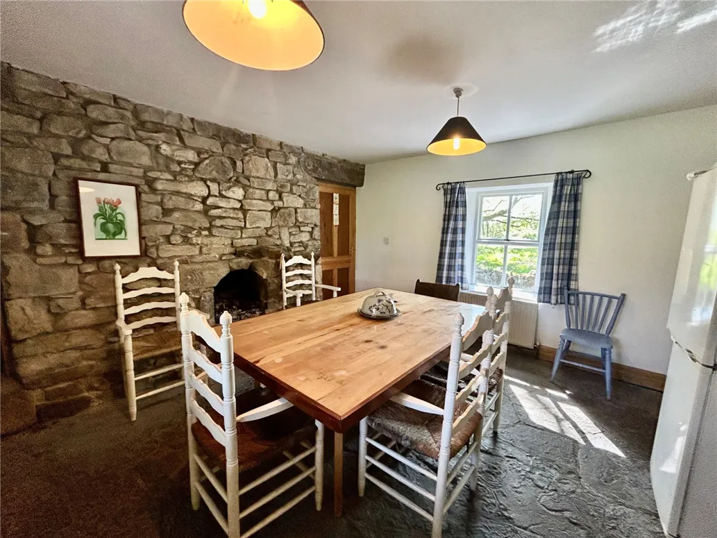Further inside is the kitchen where you’ll find another feature stone wall. Cabinets have been fitted at both high and low levels for storage. A handsome wooden dining table and chairs sit in the middle of the room.