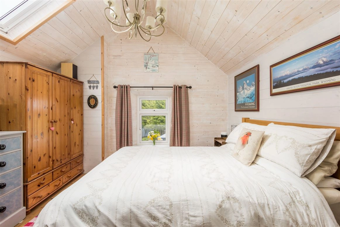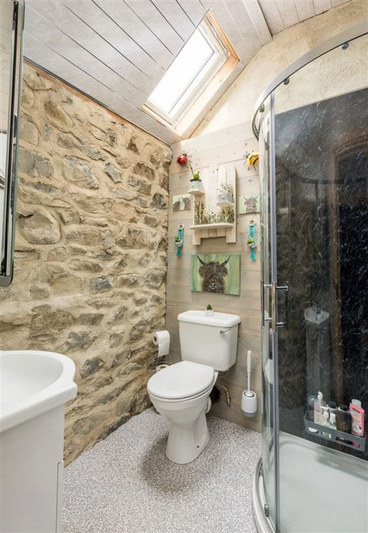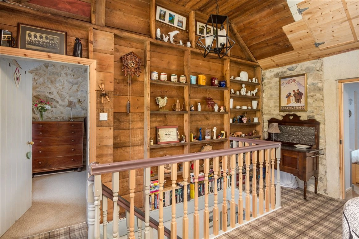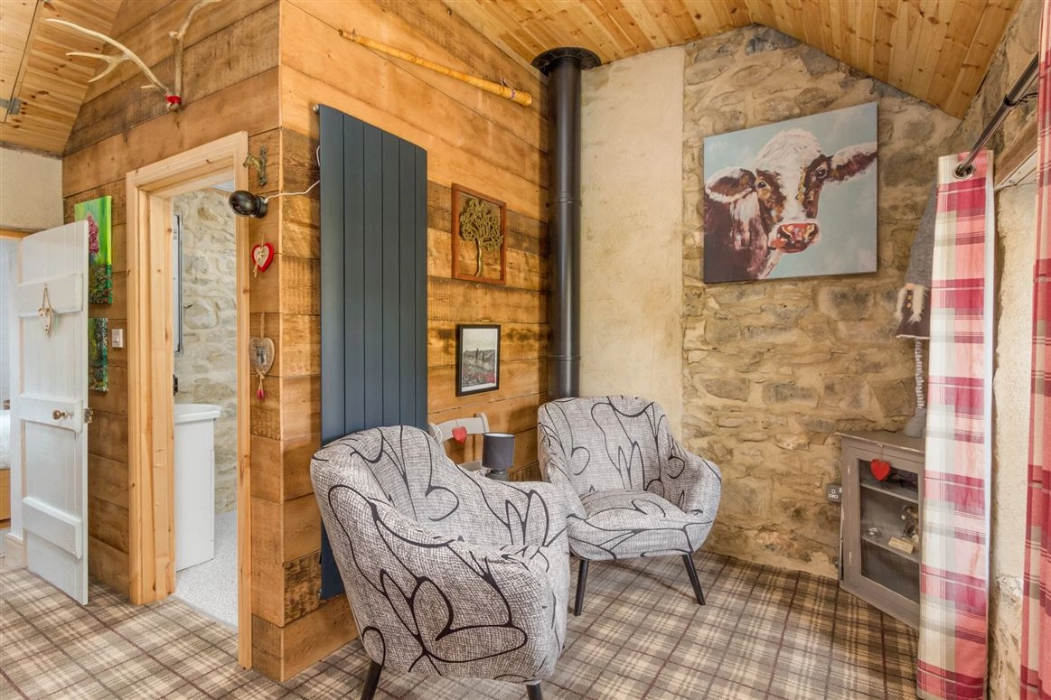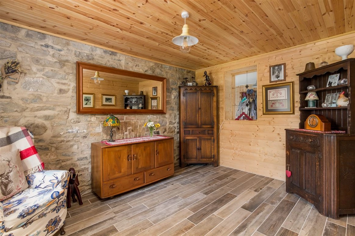 Elsewhere on the ground floor is the living room. Exposed stone walls and a traditional wood-burning stove are amongst this room’s most notable features. The downstairs bedroom has tiled wood effect flooring and panelled wood walls.