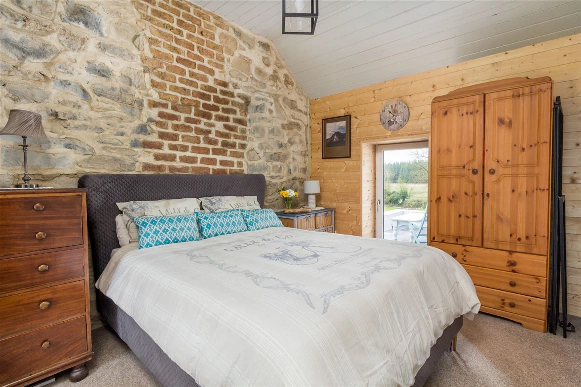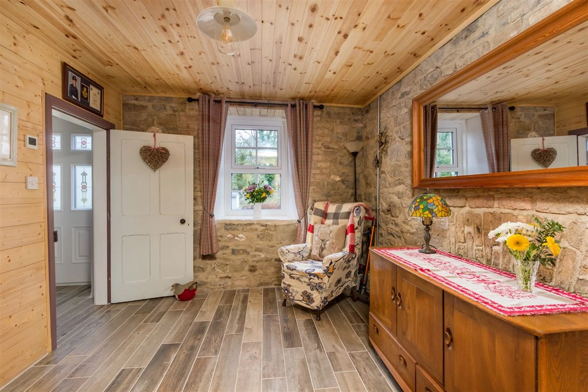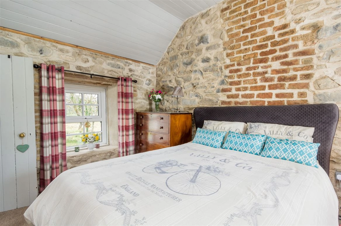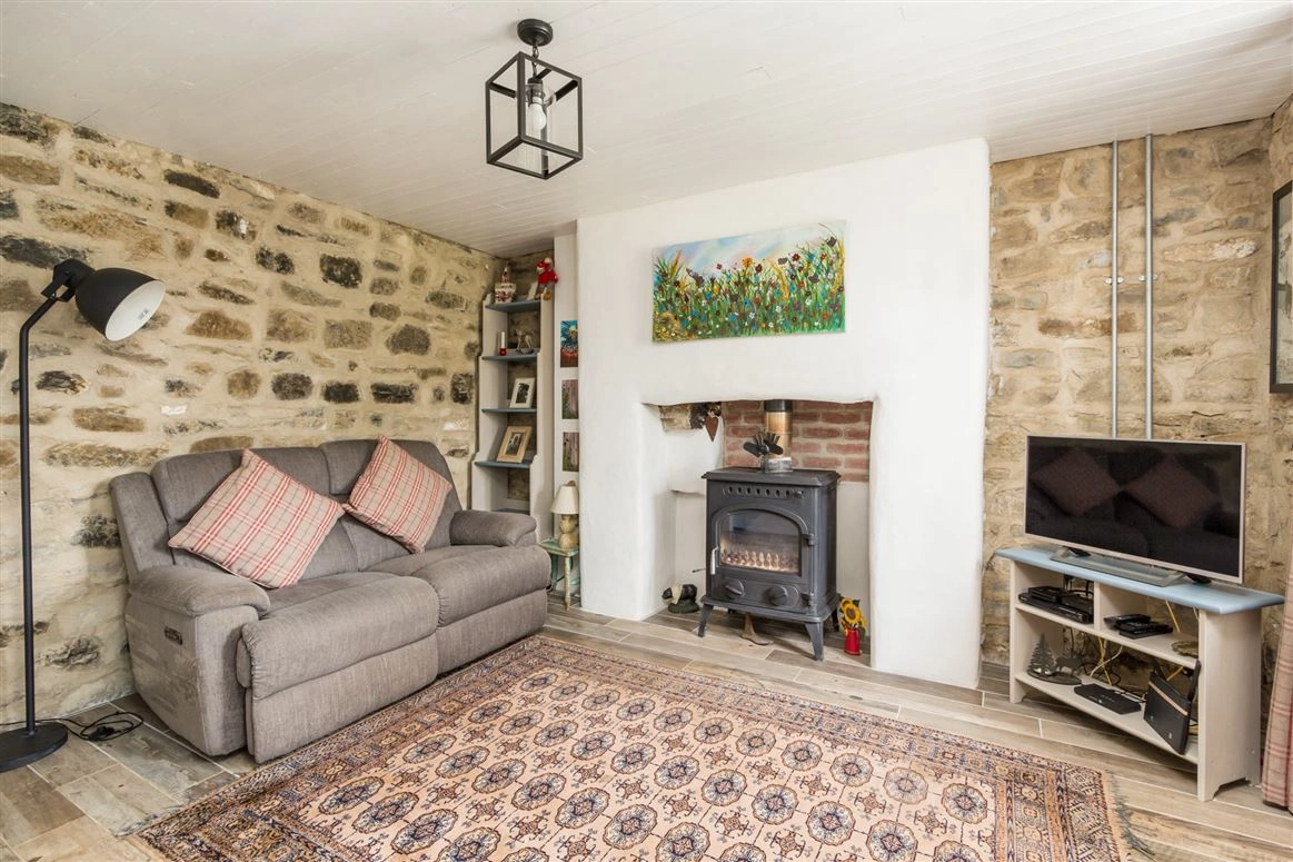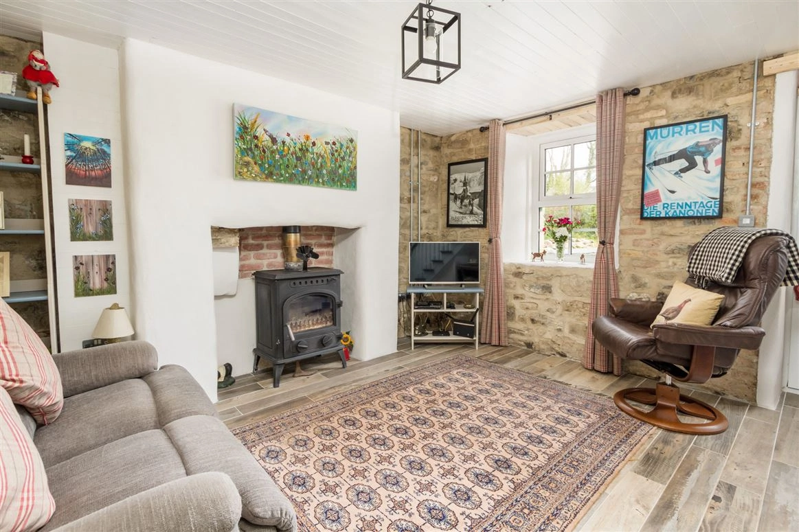 Elsewhere on the ground floor is the living room. Exposed stone walls and a traditional wood-burning stove are amongst this room’s most notable features. The downstairs bedroom has tiled wood effect flooring and panelled wood walls.