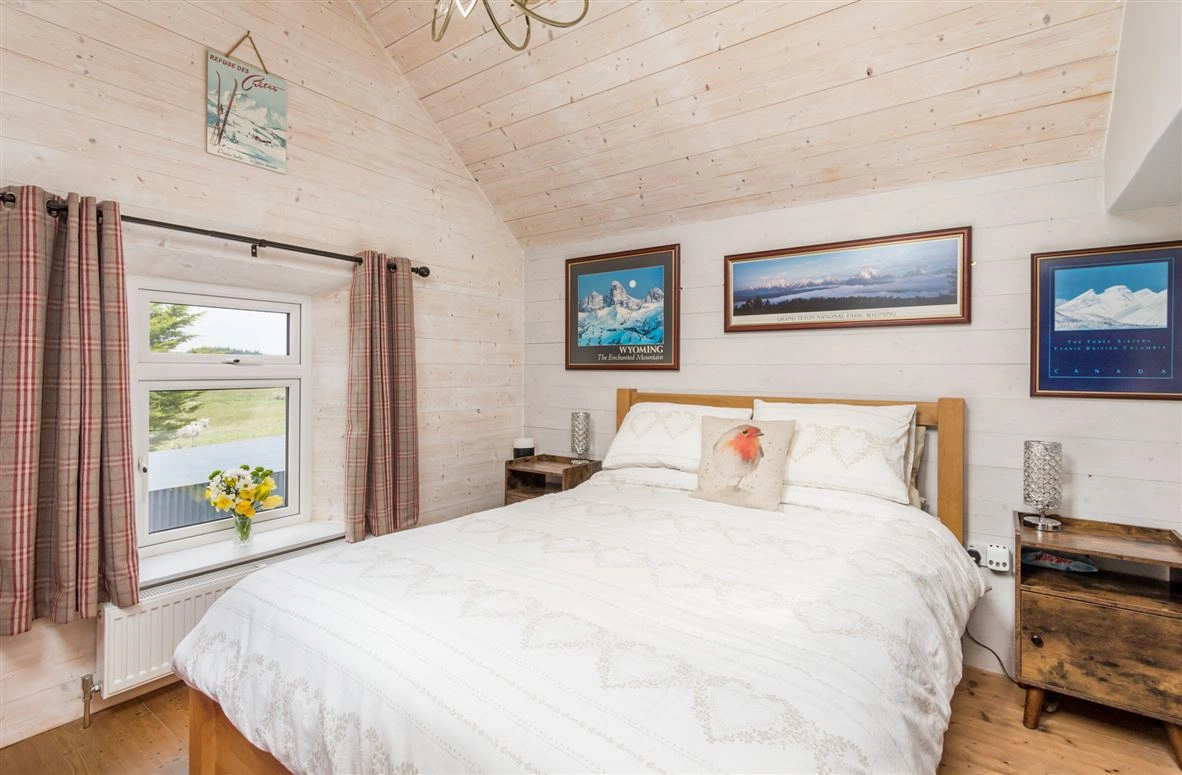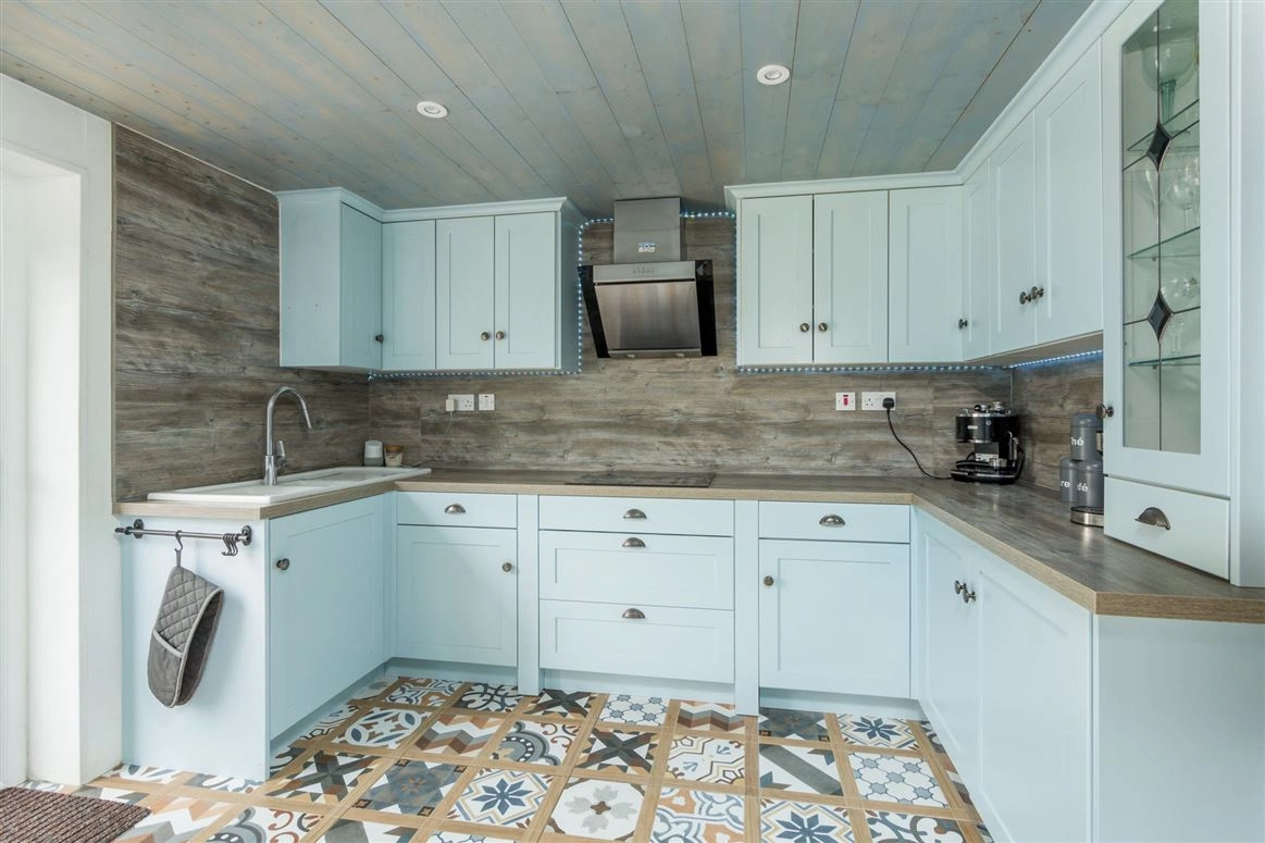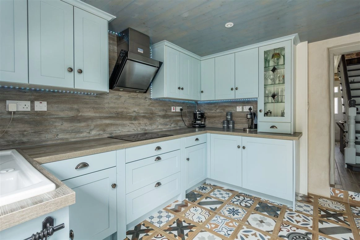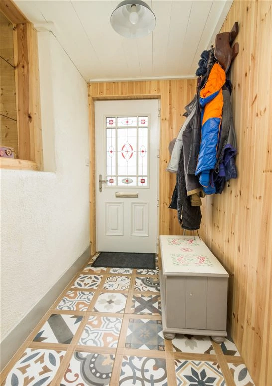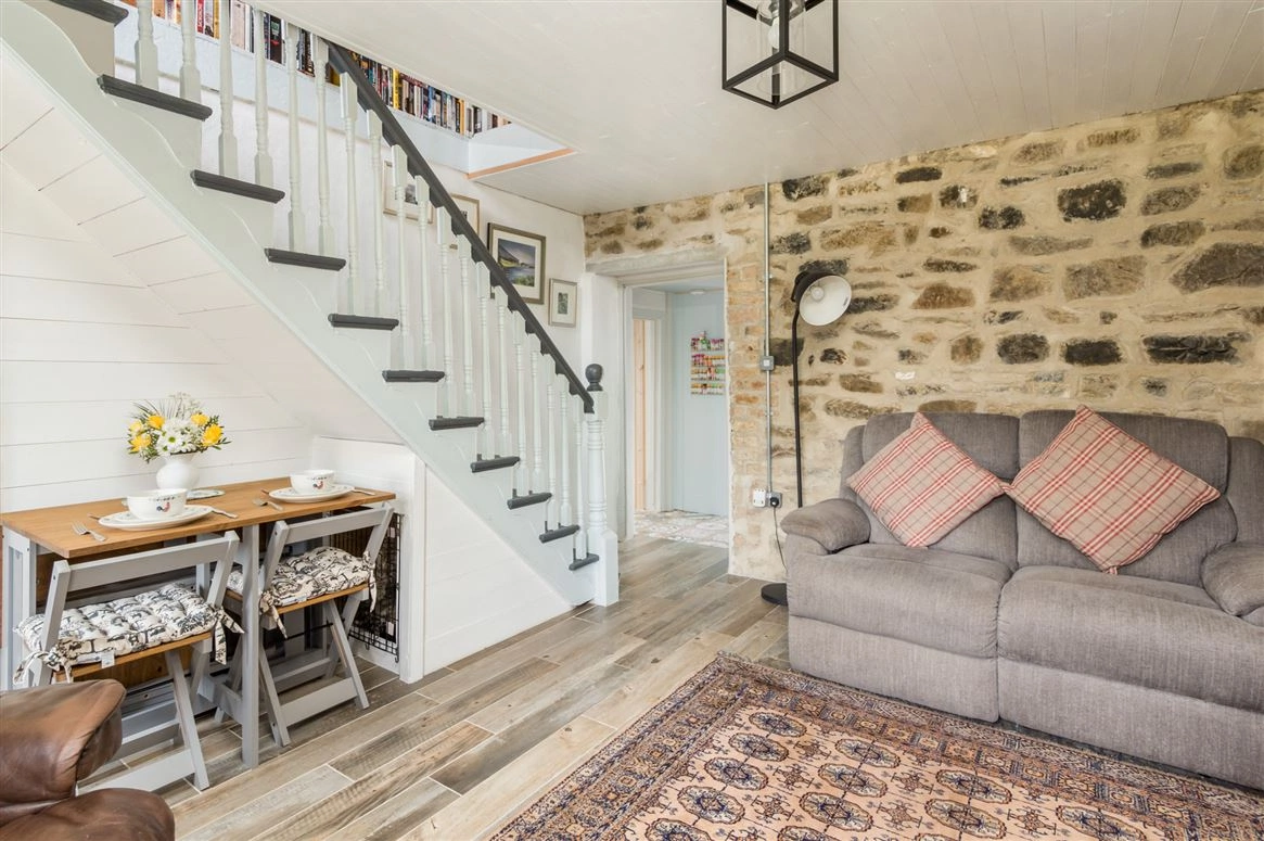 Elsewhere on the ground floor is the living room. Exposed stone walls and a traditional wood-burning stove are amongst this room’s most notable features. The downstairs bedroom has tiled wood effect flooring and panelled wood walls.