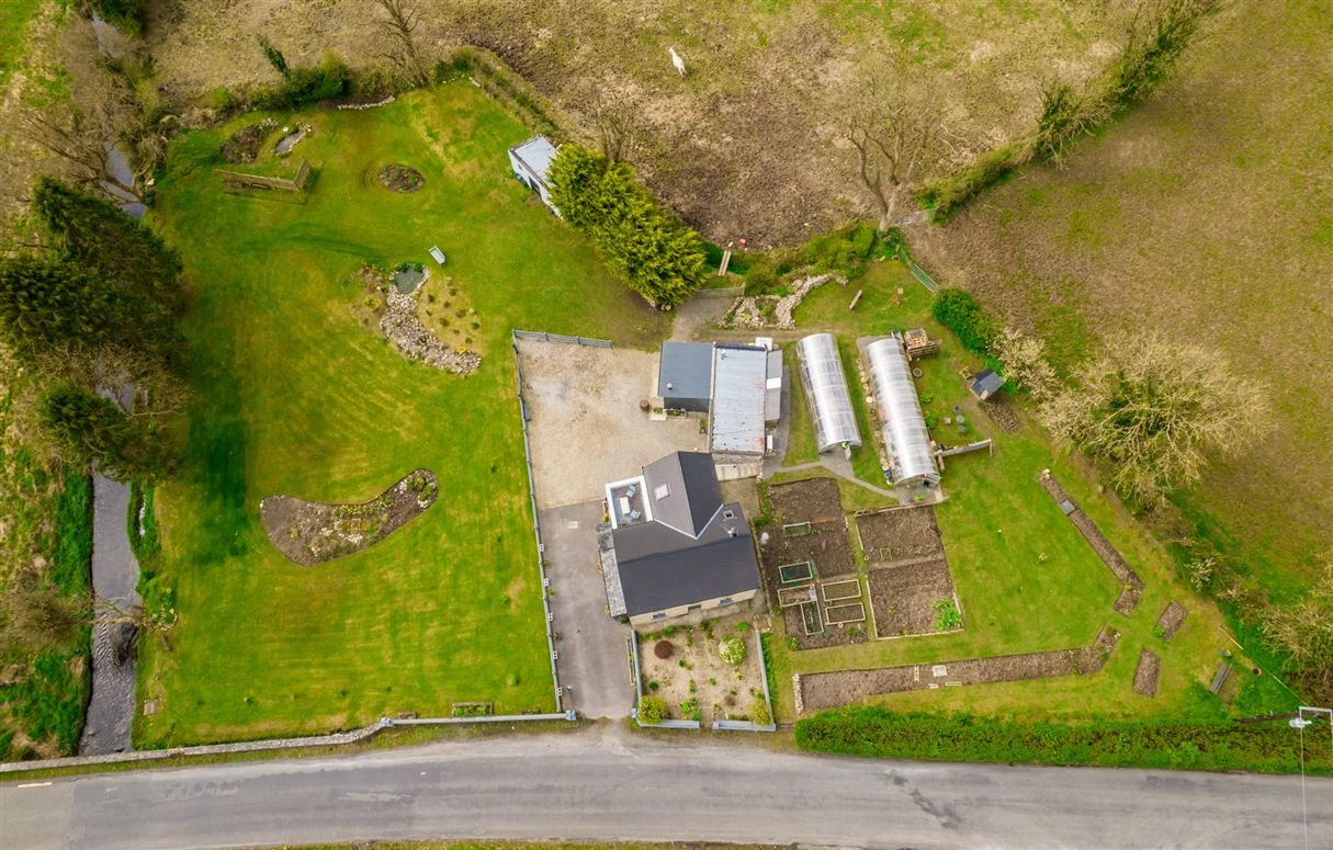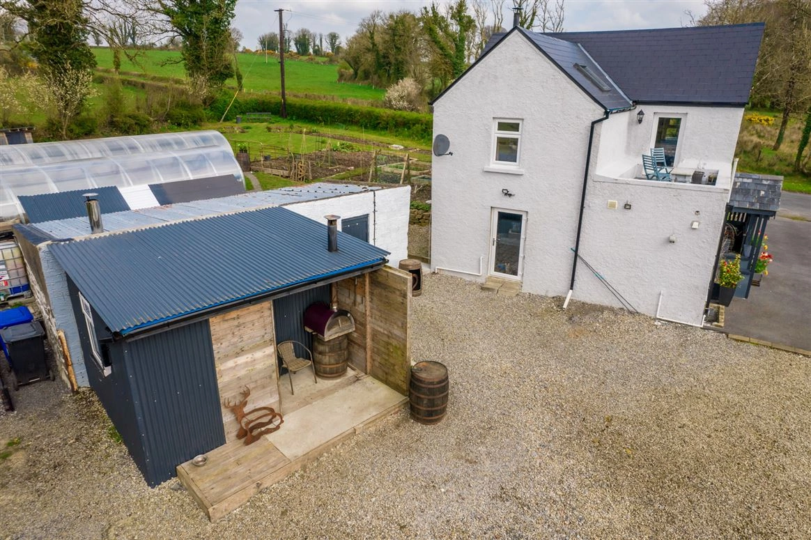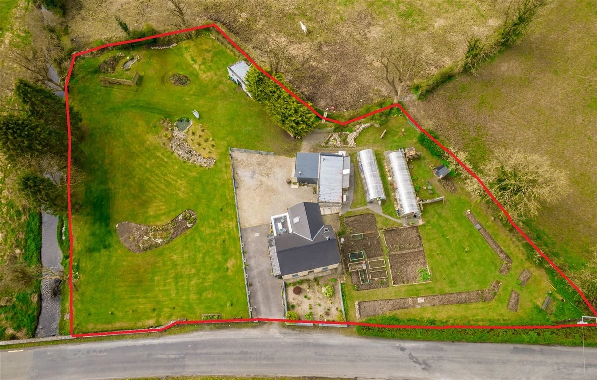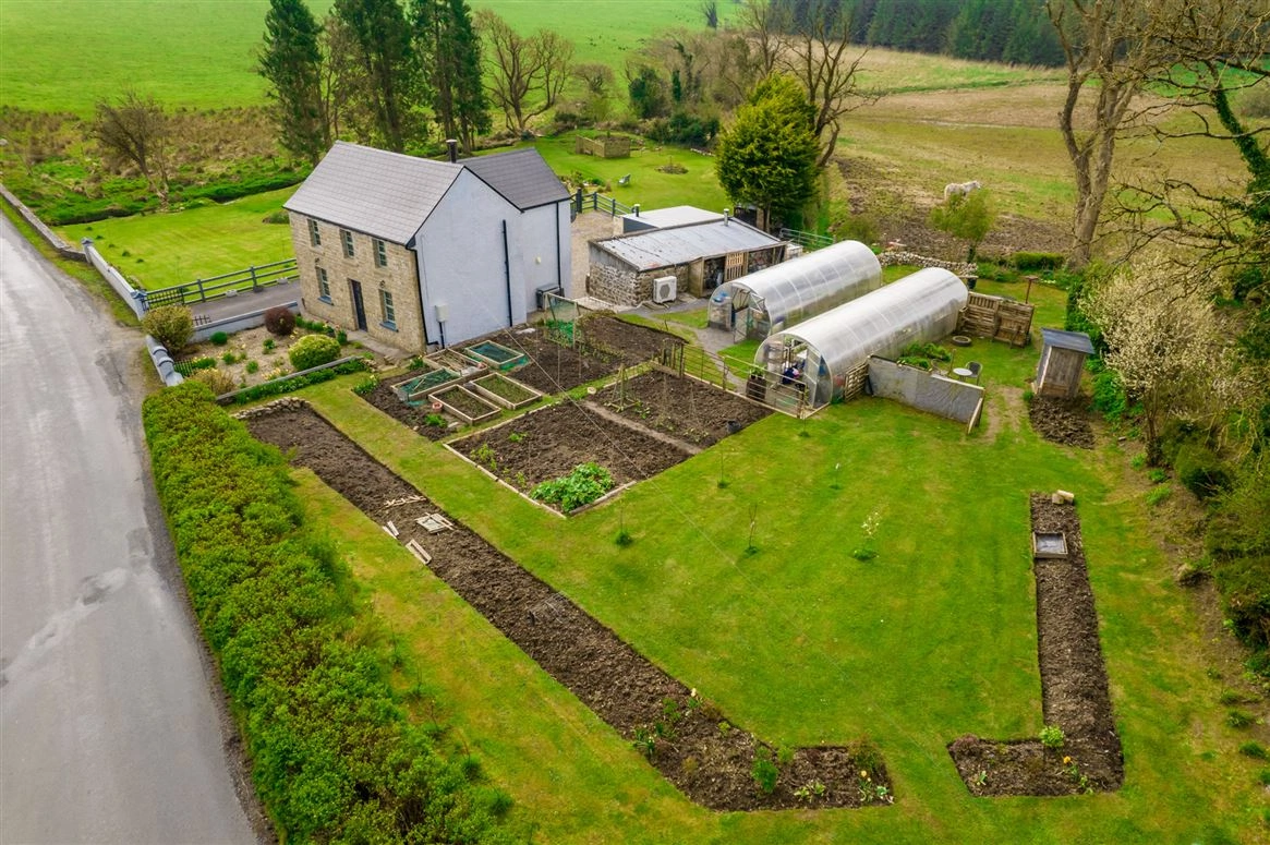 This property comprises a two-storey, three-bed residence with a large main shed which contains a wood-burning stove and has both electricity and running water. The grounds also feature two large polytunnels with electricity and wifi and a water and a garden shed. Inside, the accommodation features a ground-floor living/dining room, a kitchen, one bedroom and the family bathroom. Two further bedrooms can be found on the first floor along with a large balcony, a bathroom and a large landing with a comfortable sitting/reading area.