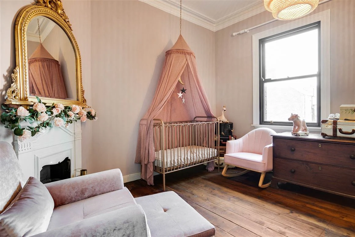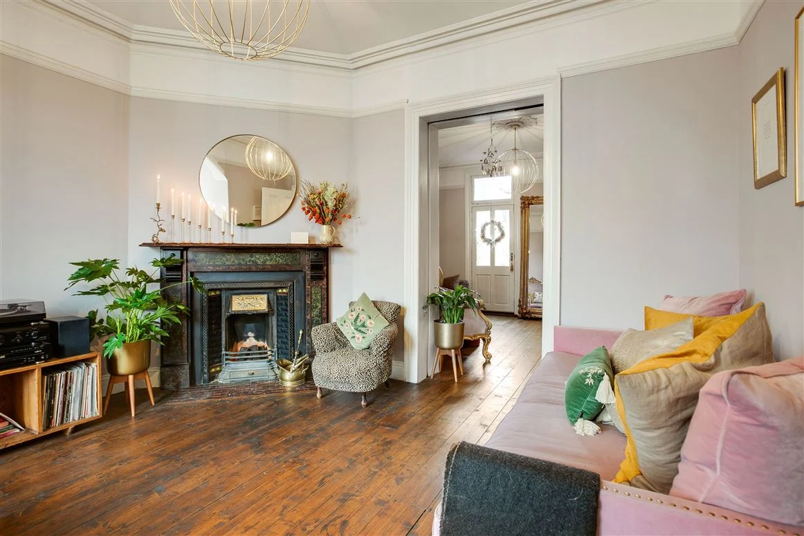 Interestingly the twin marble and cast iron fireplaces here are not against the opposite wall, but located at an angle in the centre of the house, allowing them to share a flue. The timber floors continue here with a beautiful arch framing the bay window.
