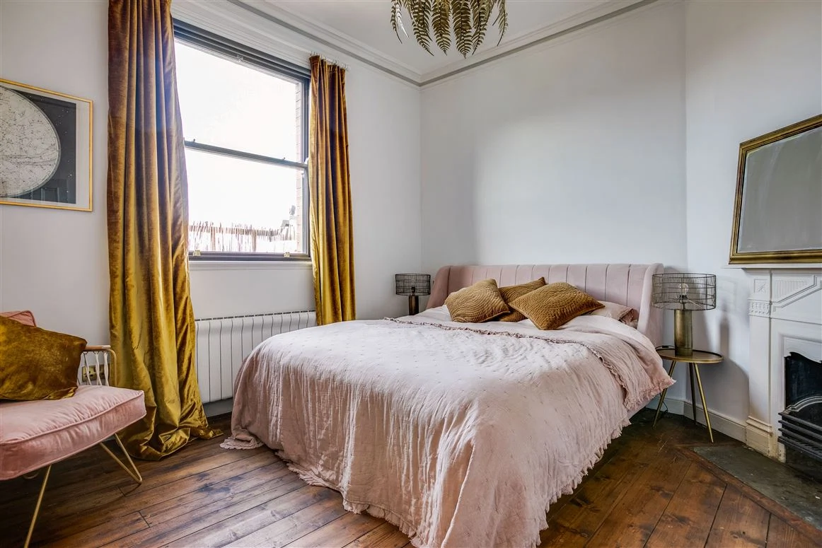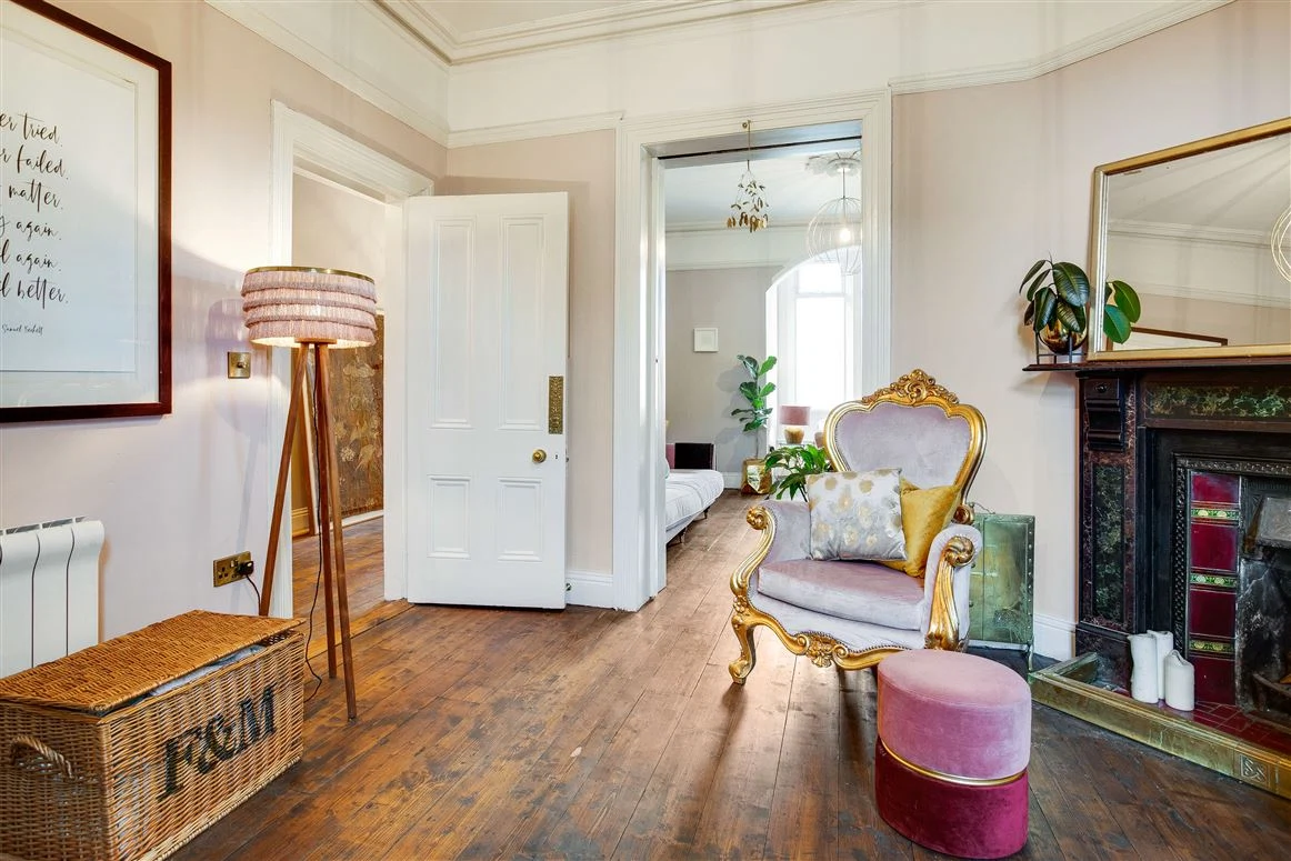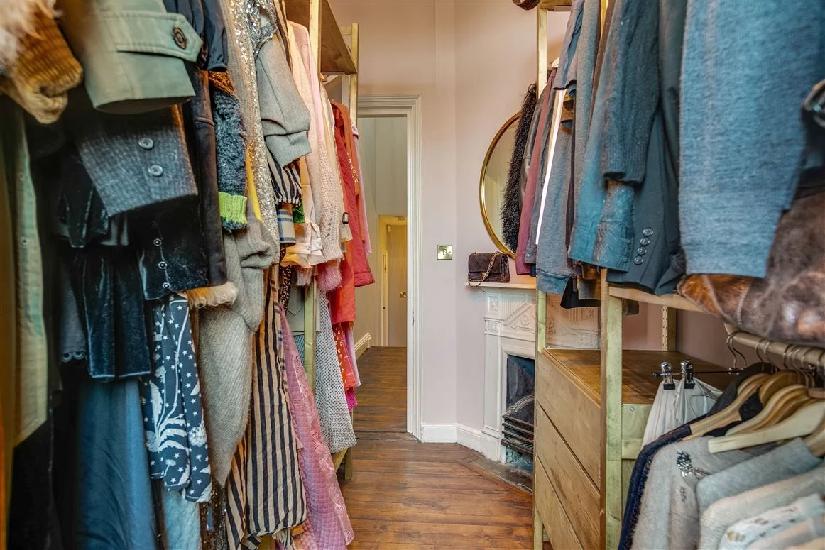 Upstairs are three bedrooms and one room that currently acts as a luxurious dressing room (the current homeowner is known for her love of sequined pieces after all!). The first bedroom is on the return, a large double with its own cast iron mantlepiece. The other two bedrooms on the first floor, including the principal room, both have cast iron fireplaces too, as does the dressing room.