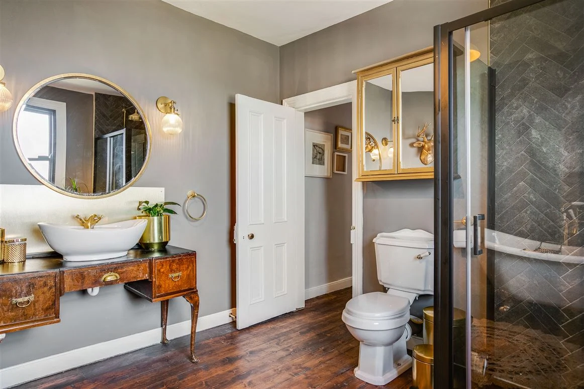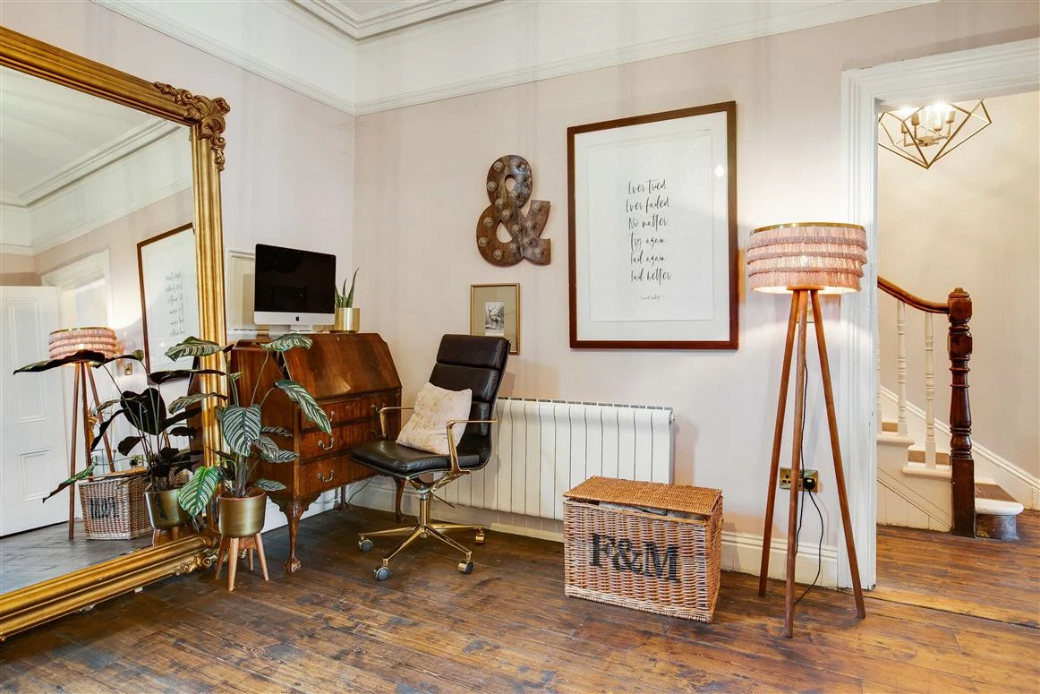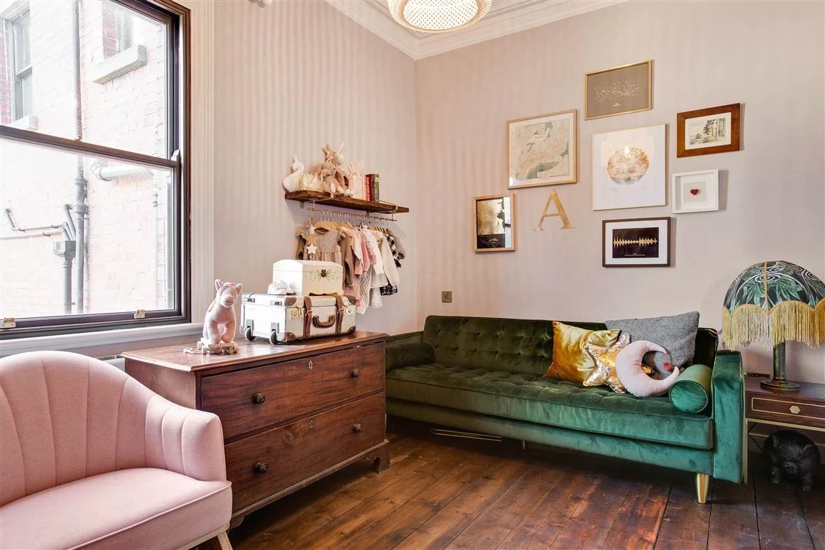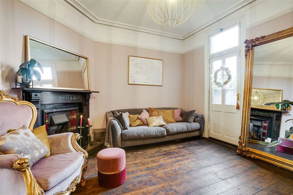 Upstairs are three bedrooms and one room that currently acts as a luxurious dressing room (the current homeowner is known for her love of sequined pieces after all!). The first bedroom is on the return, a large double with its own cast iron mantlepiece. The other two bedrooms on the first floor, including the principal room, both have cast iron fireplaces too, as does the dressing room.