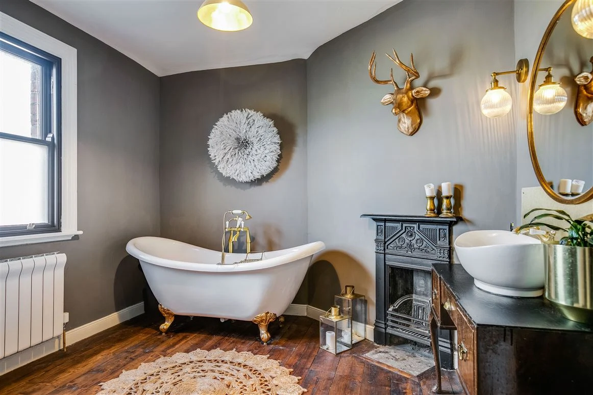 On the top floor is the family bathroom with a claw foot free-standing tub and a peaceful office space. The garden is south-facing and there’s off-street parking for two cars.