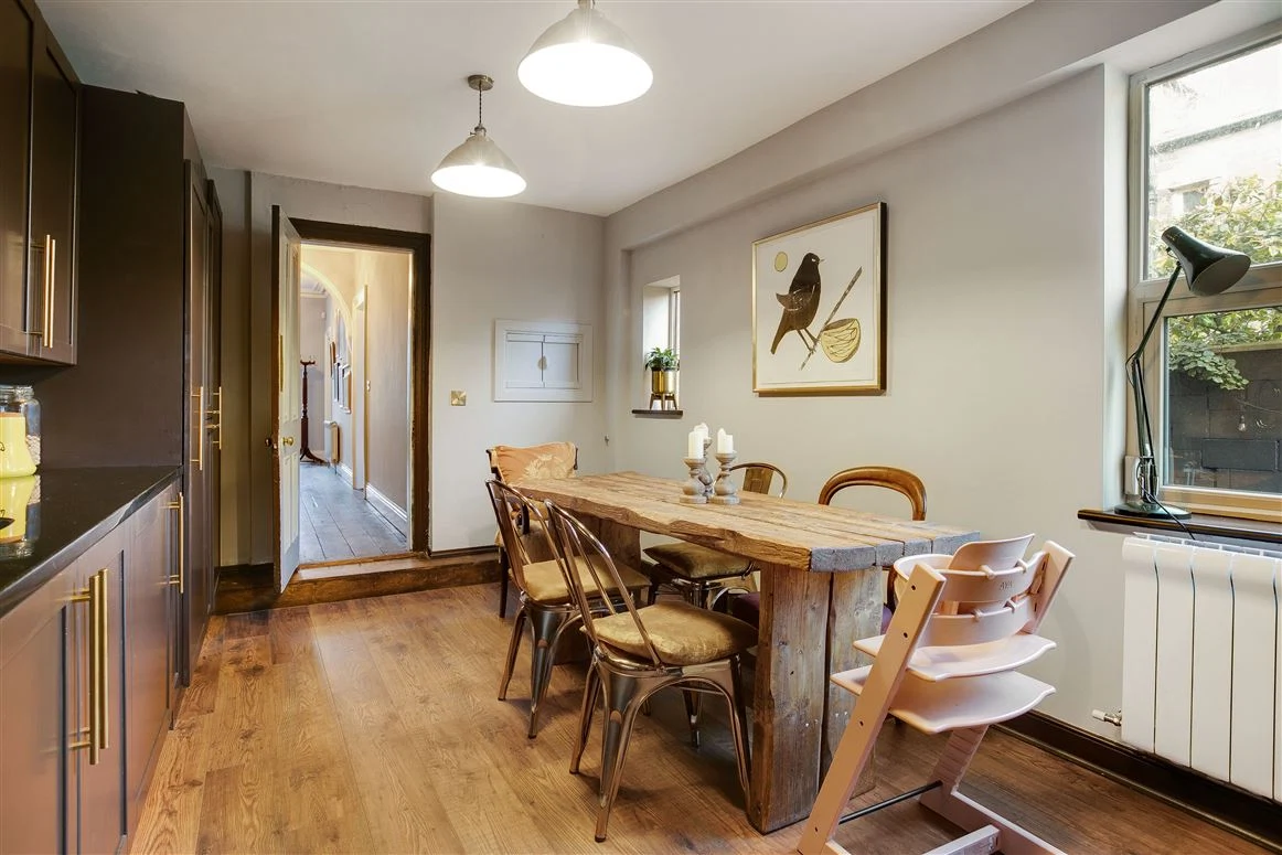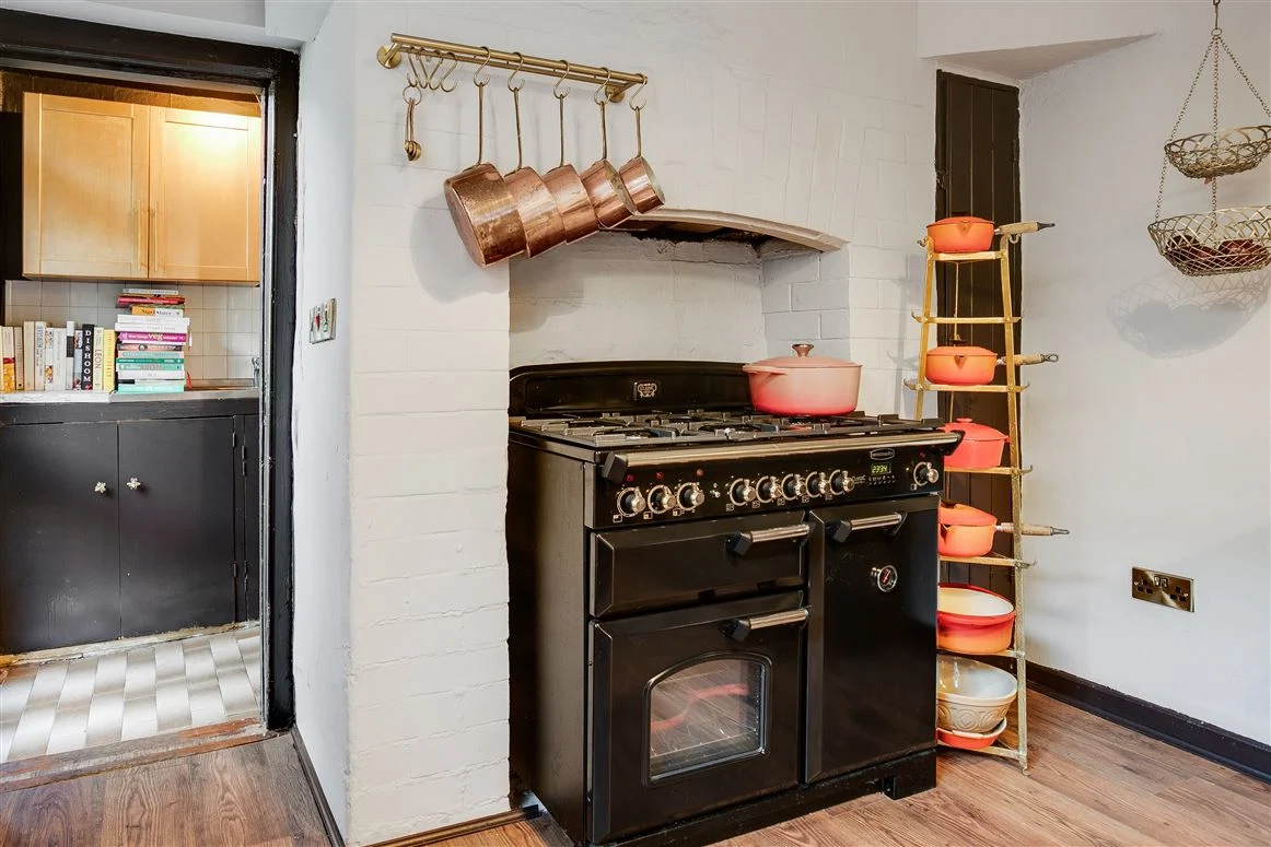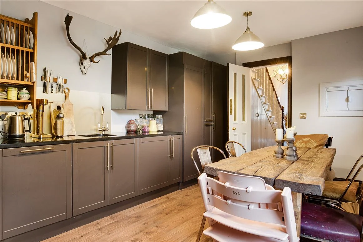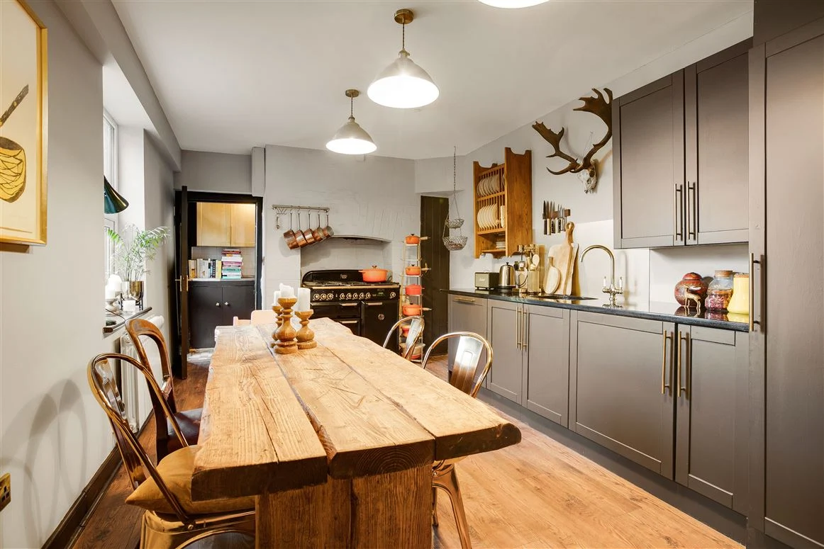The kitchen is located beyond the hall. The L-shaped kitchen is painted in a warm charcoal grey with solid granite countertops and brass finishings, leaving ample room for a large dining table. The centre of the space is a large black range. Behind it, is a utility and a guest WC and shower room, as well as another door onto the garden.