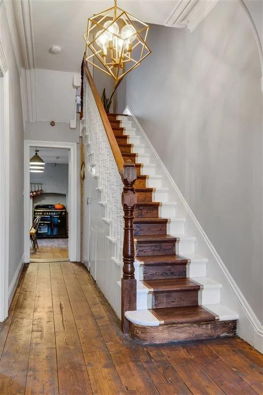 A sheltered porch leads you into the hall with original timber floor, twin arches and artfully exposed treads up the staircase to the upper floor. To the left are two interconnecting rooms. The front home, featuring that distinctively square Edwardian bay window, is the main living room.