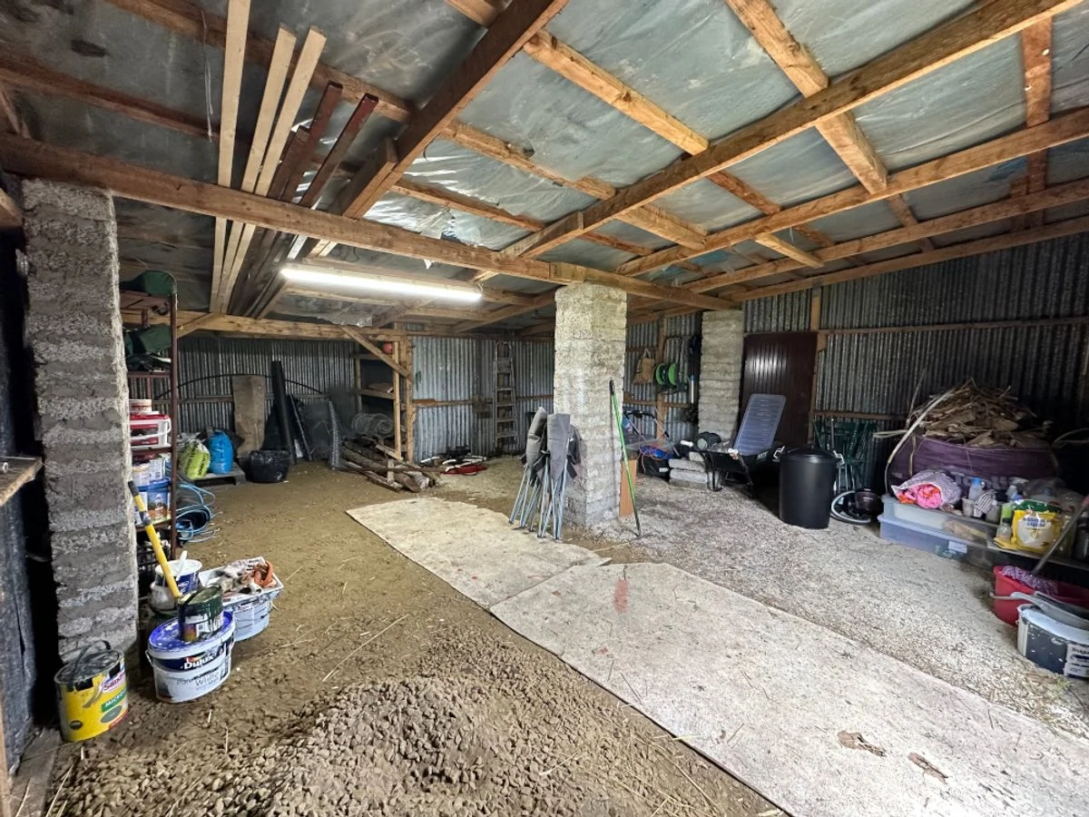 Outside, there is a large shed that can be used for storage, while the garden is well-maintained.