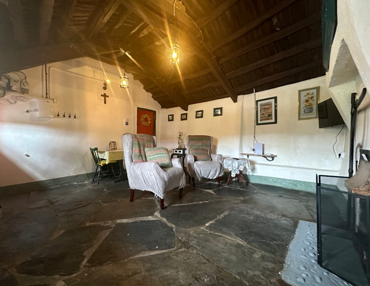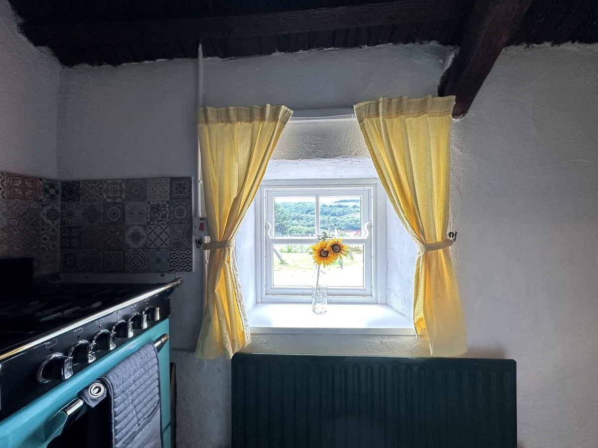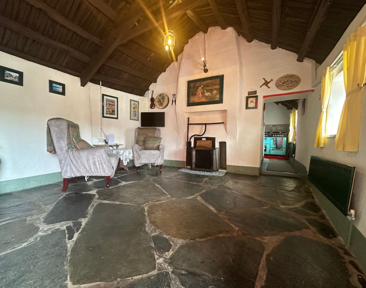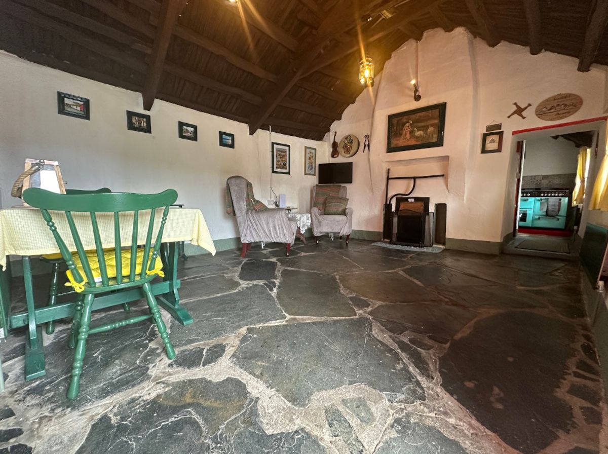 Many of the original features of this cottage remain intact, and it still has the traditional layout. You enter the house into the living and dining space, which has a slate floor, vaulted ceiling and an open fireplace.