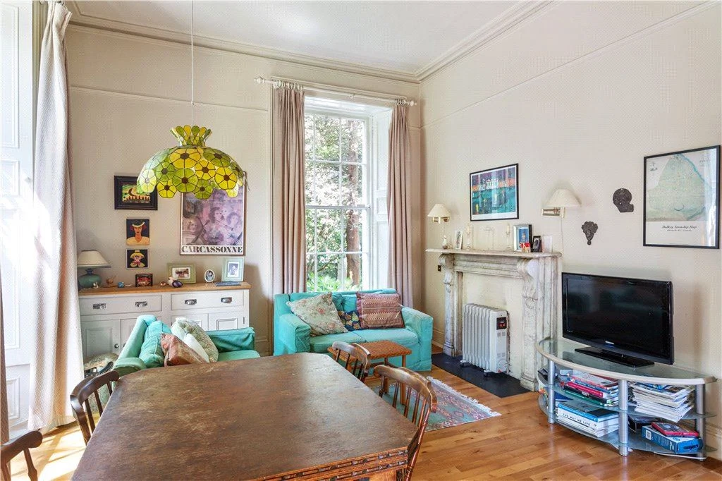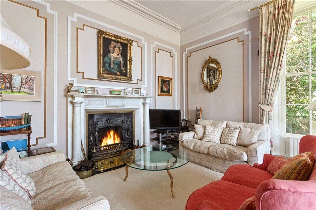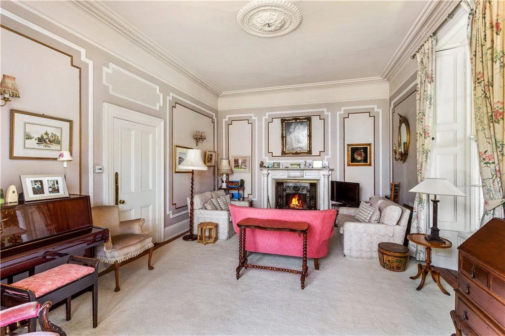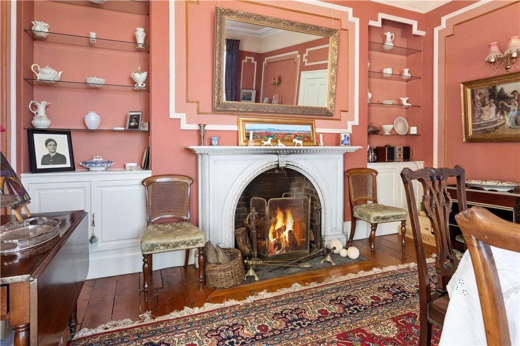 The drawing room on the other side of the hallway has wall panelling, a picture rail, and an early Victorian marble fireplace with ornate cast iron decorative details.