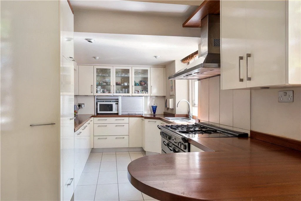 Towards the back of the house on this level are the kitchen and breakfast room, separated by folding glazed doors.