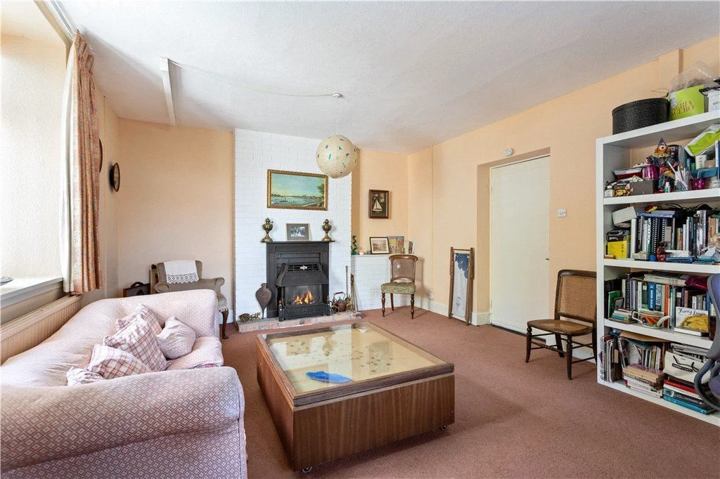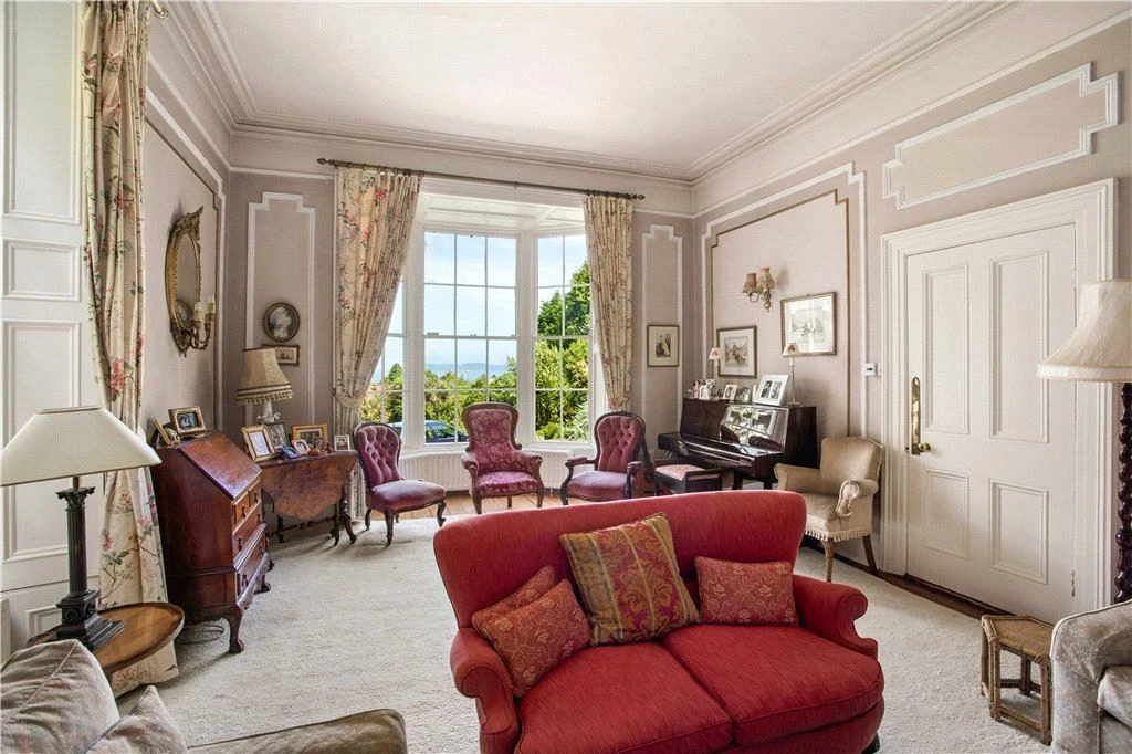 To the left is the dining room, a dual aspect space with sash windows giving sea views. There is also a large marble fireplace.