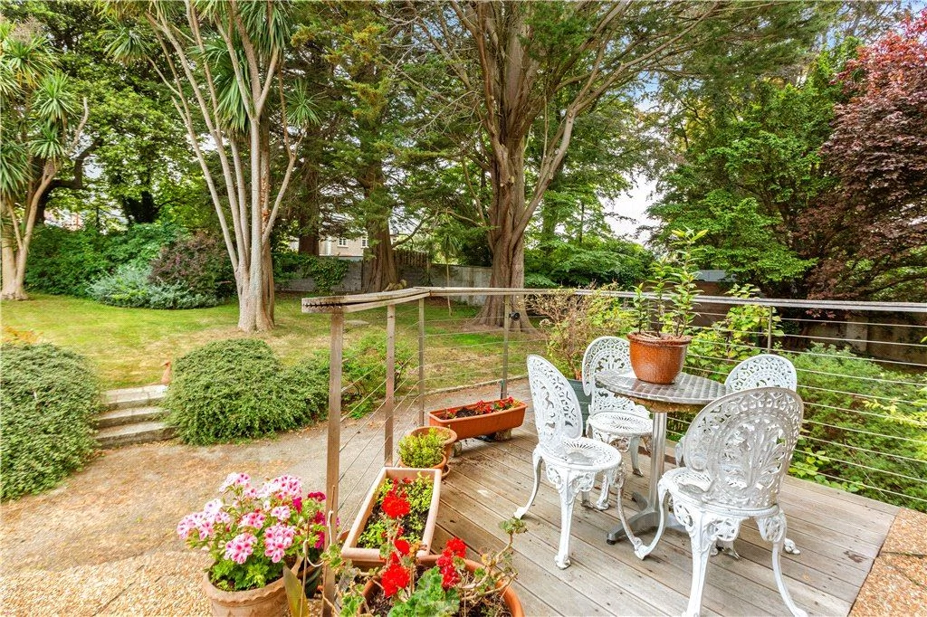 Outside, the large garden is bordered by mature trees, providing privacy. The front lawn is tiered, while at the back there is a raised deck area that leads out from the kitchen, perfect for outdoor dining.