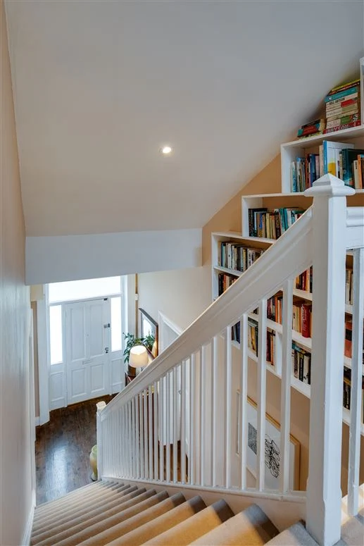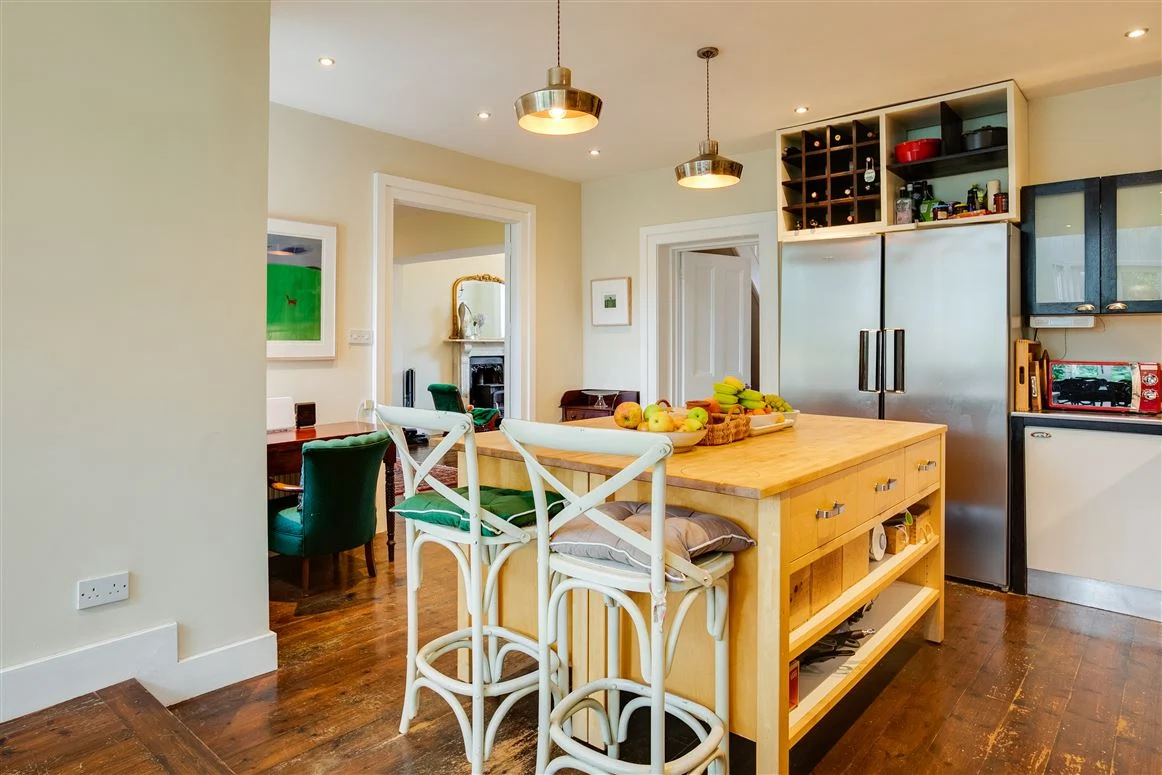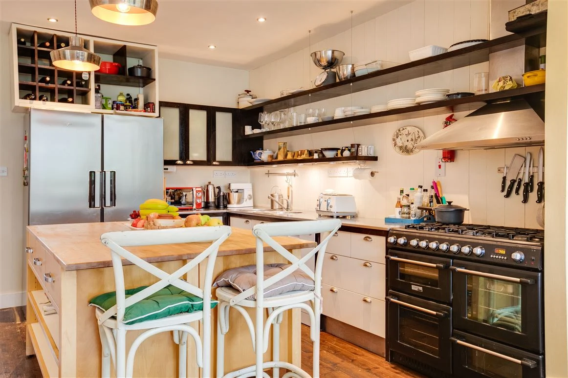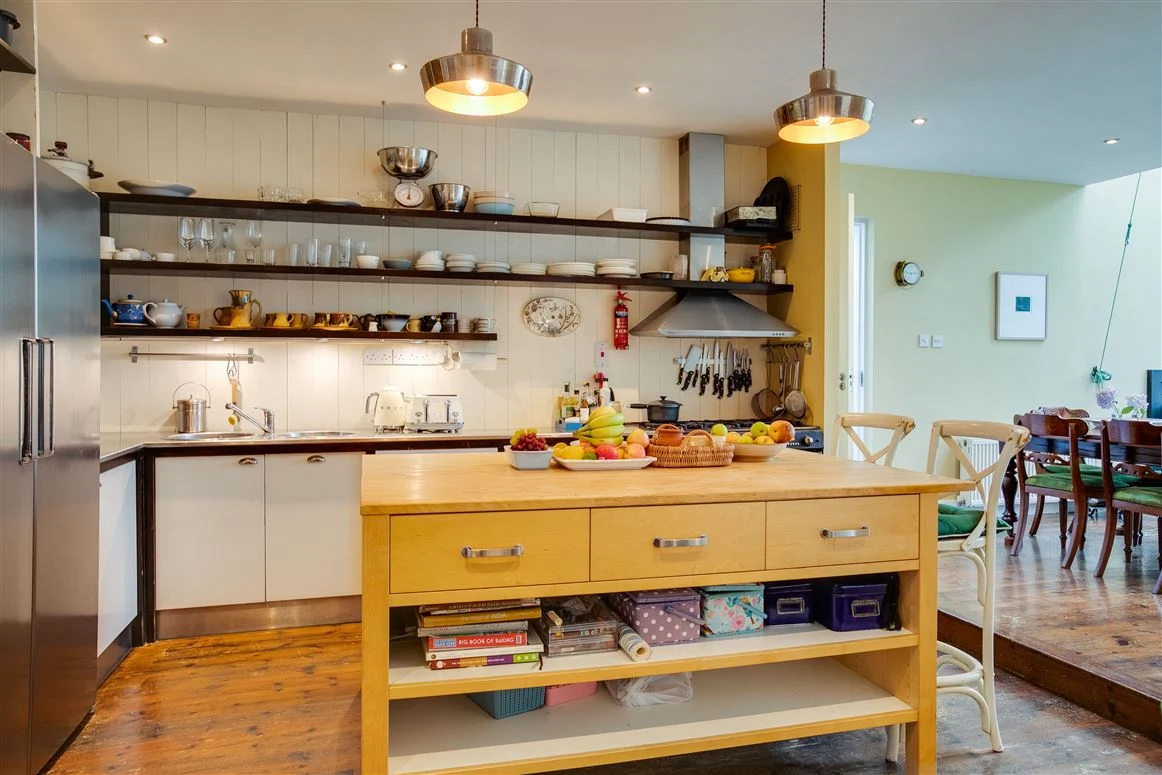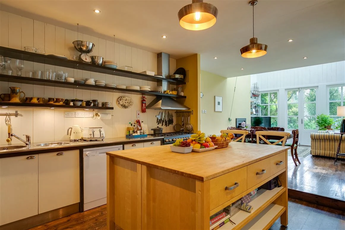The open plan kitchen and family room is an exceptionally bright space. The family room has a vaulted double-height ceiling with access to the garden. Open shelving in the kitchen as well as a large island units provide plenty of storage, and there is also a utility room off this space.