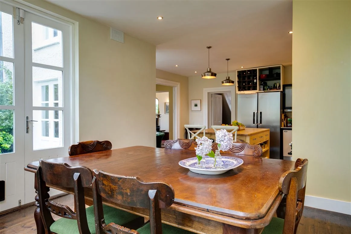 An interconnected formal living room and dining room are elegant spaces, with a sash window to the front, and French doors leading out to the back garden. The living room has a marble fireplace, while both spaces have solid hardwood floors.