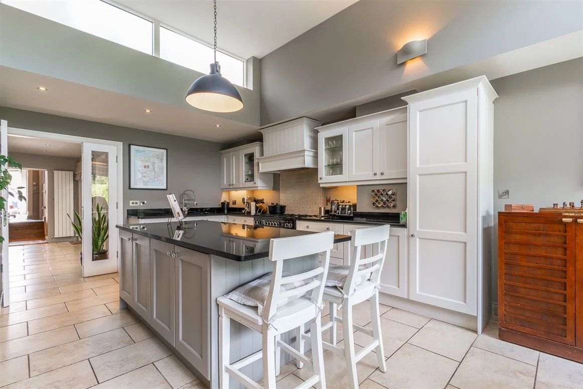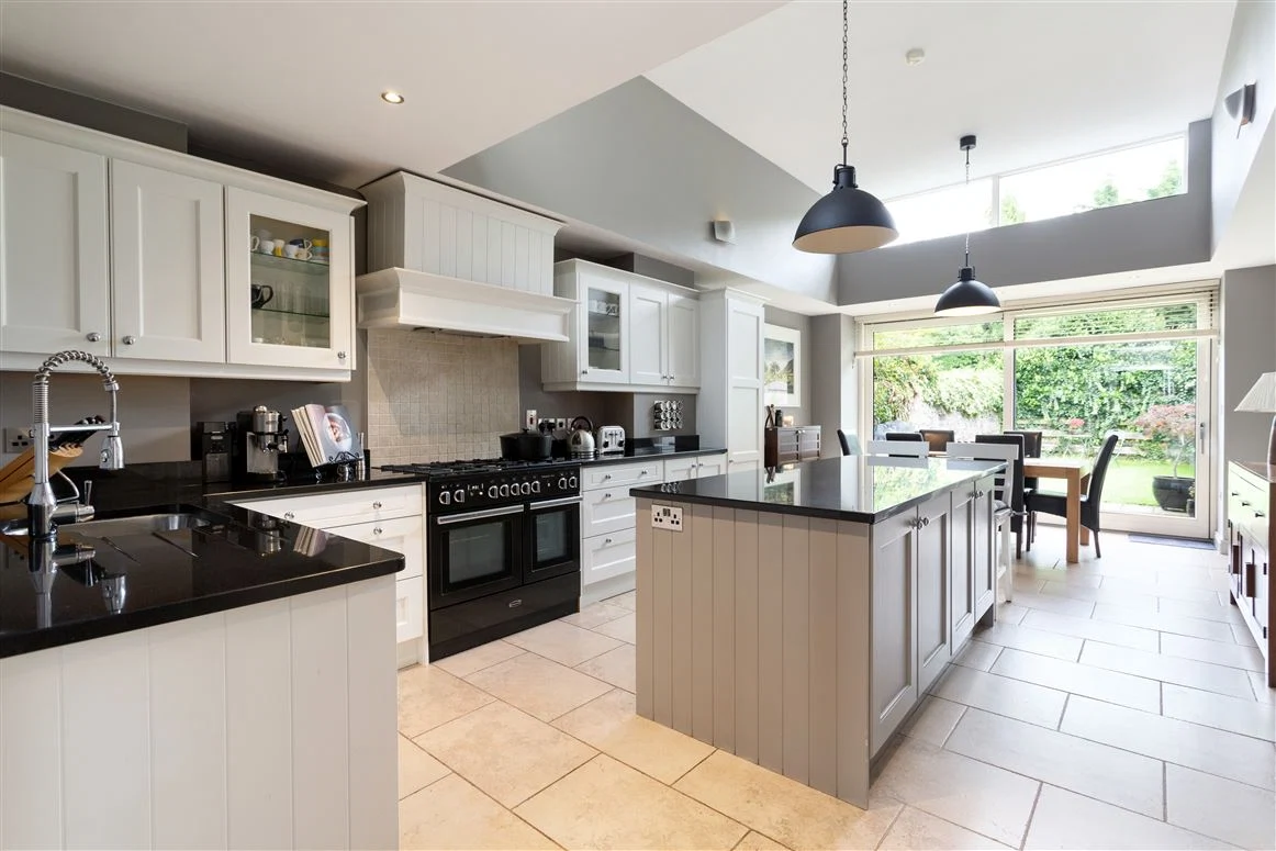 A large space with a feature island, a range, the kitchen and dining space has a large window looking out to the garden, as well as a large sliding door.