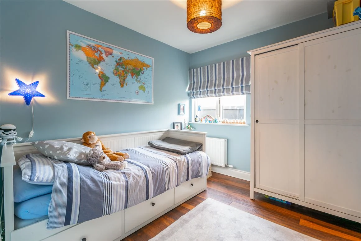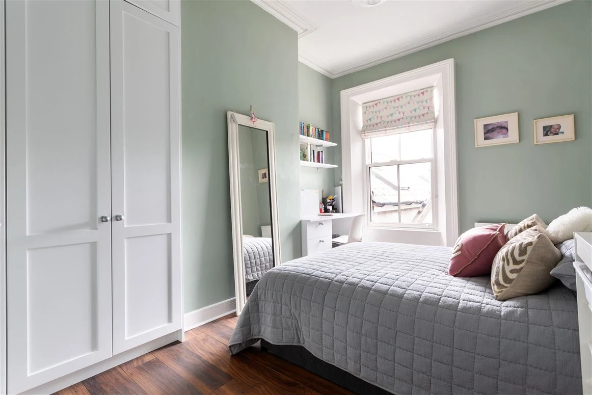 Upstairs, there are three bedrooms and a shower room. The bedroom at the front of the house has two large sash windows and a wooden floor, and one of the other bedrooms has a built-in wardrobe.
