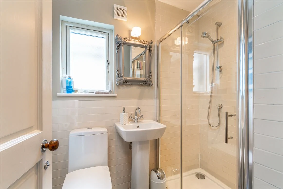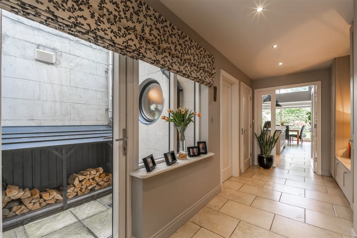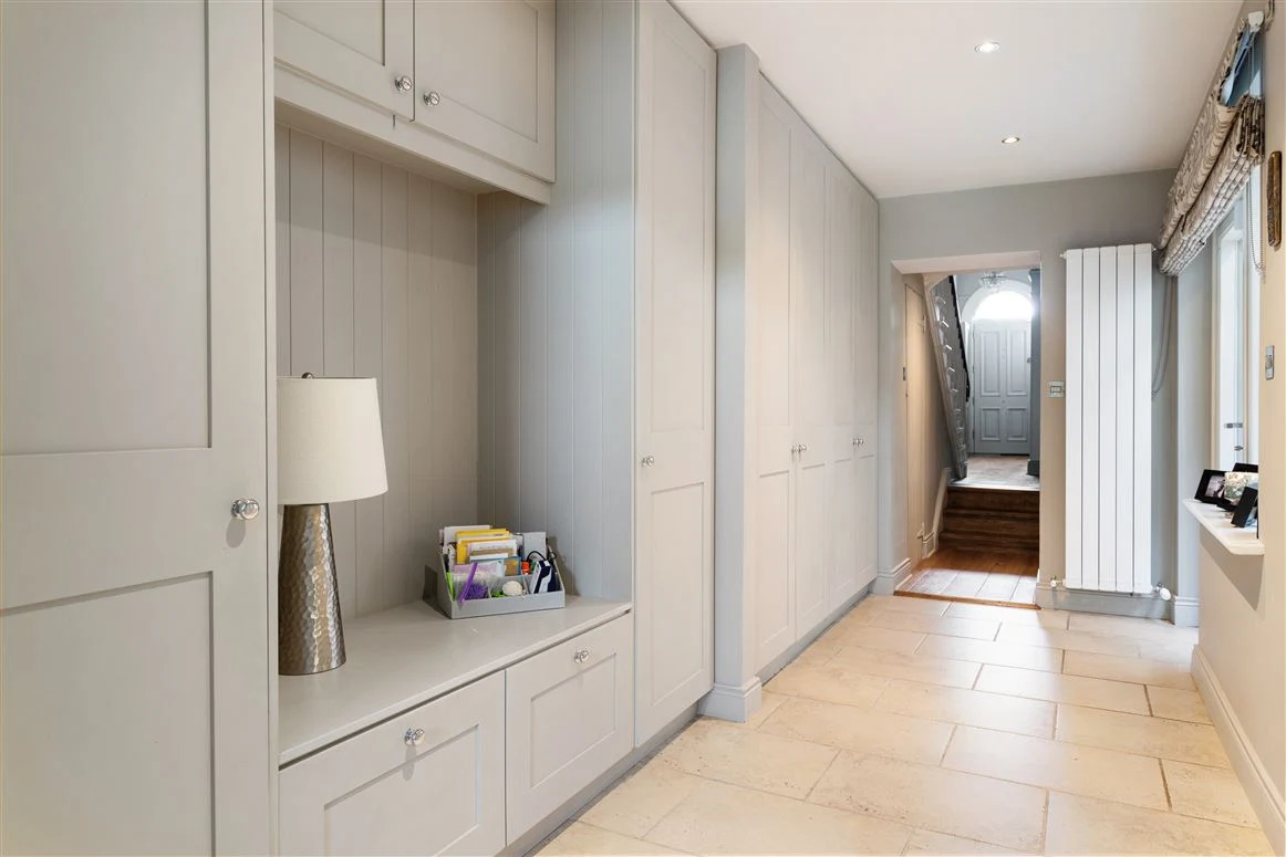 At the back of the house on this level is a large extension. A hallway with built-in storage leads to a shower room, and the kitchen and dining space at the back.