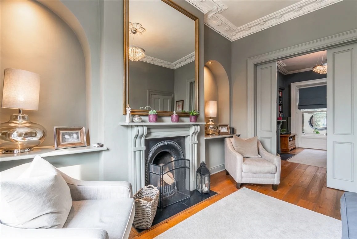 You enter the home into the hallway, which has a decorative archway and cornicing, and a wooden floor. To the left of this space are two interconnected reception rooms. The front room has a large sash window and a feature fireplace, with alcoves on either side.