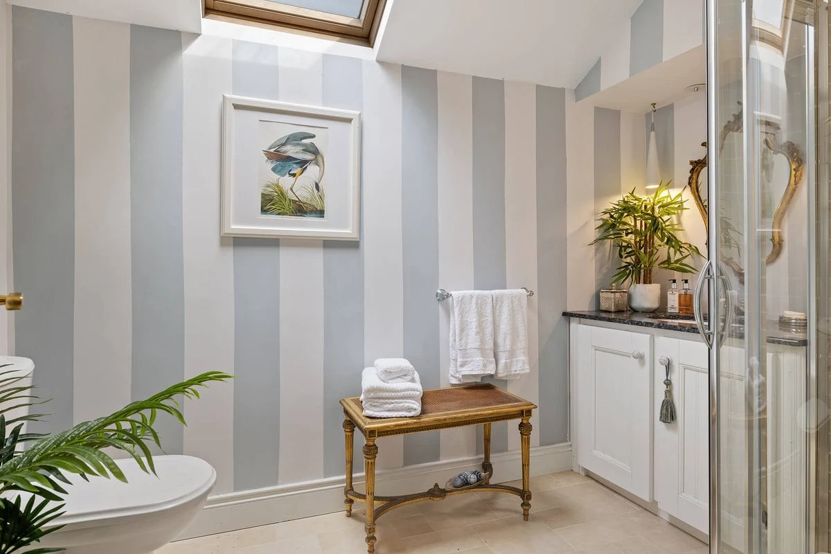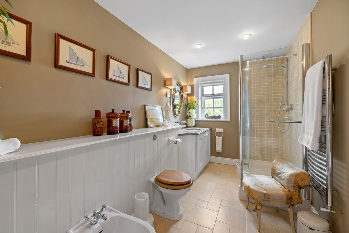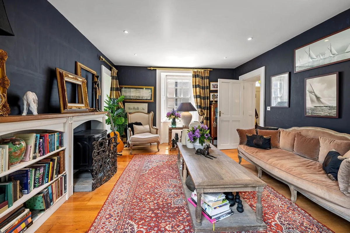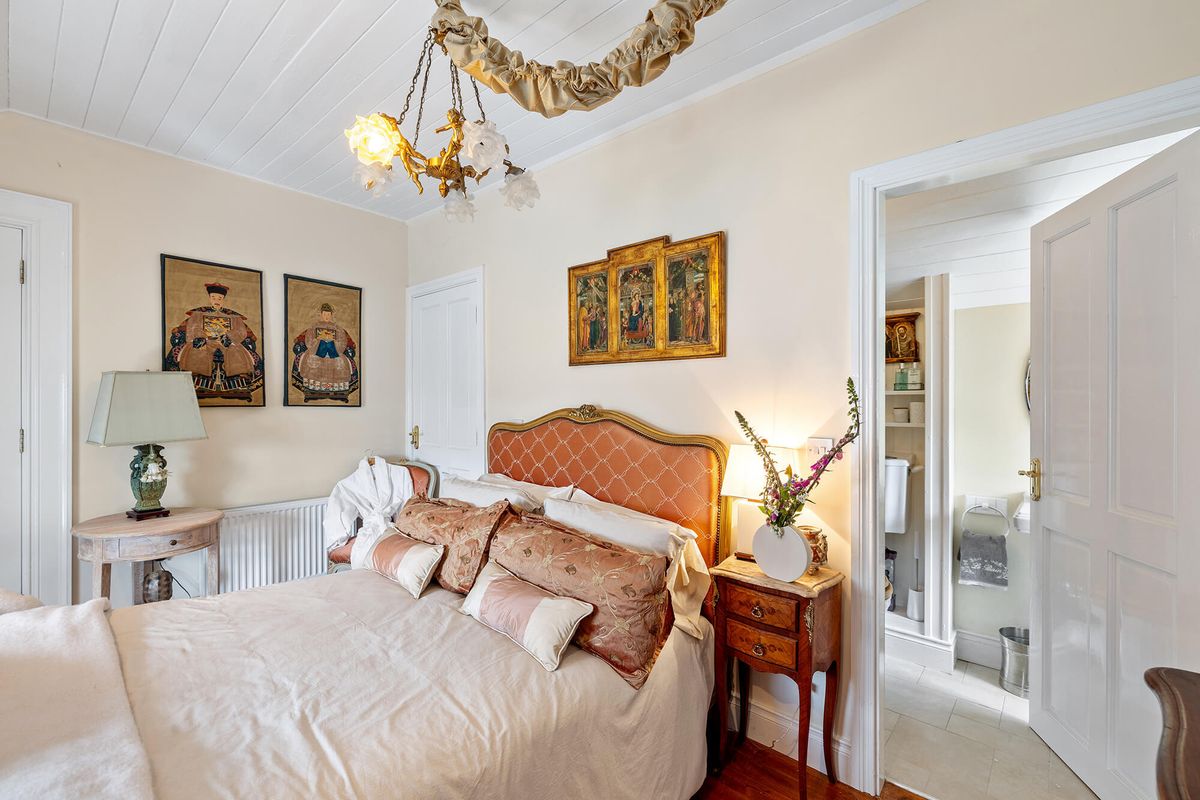 On the first floor, there are two bedrooms, one with a dressing room and ensuite. There is also a family bathroom on this level. On the second floor is the main bedroom, a large space complete with its own walk-through wardrobe, generous ensuite and a balcony from which to admire views of the harbour. Another bedroom on this level brings the total to four.