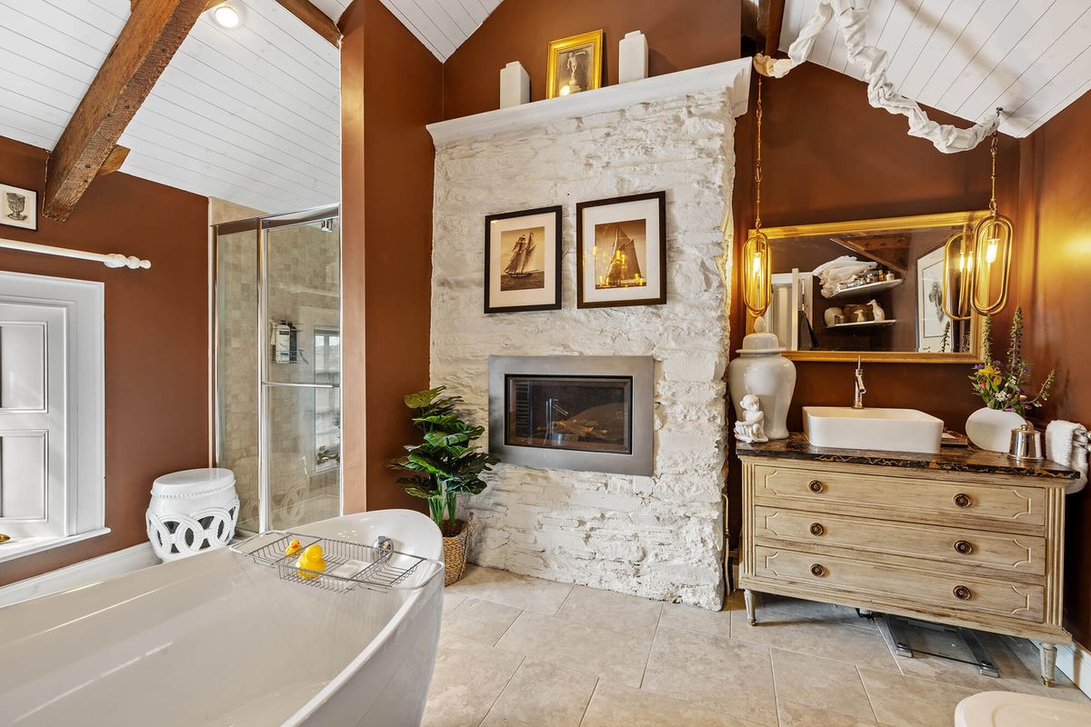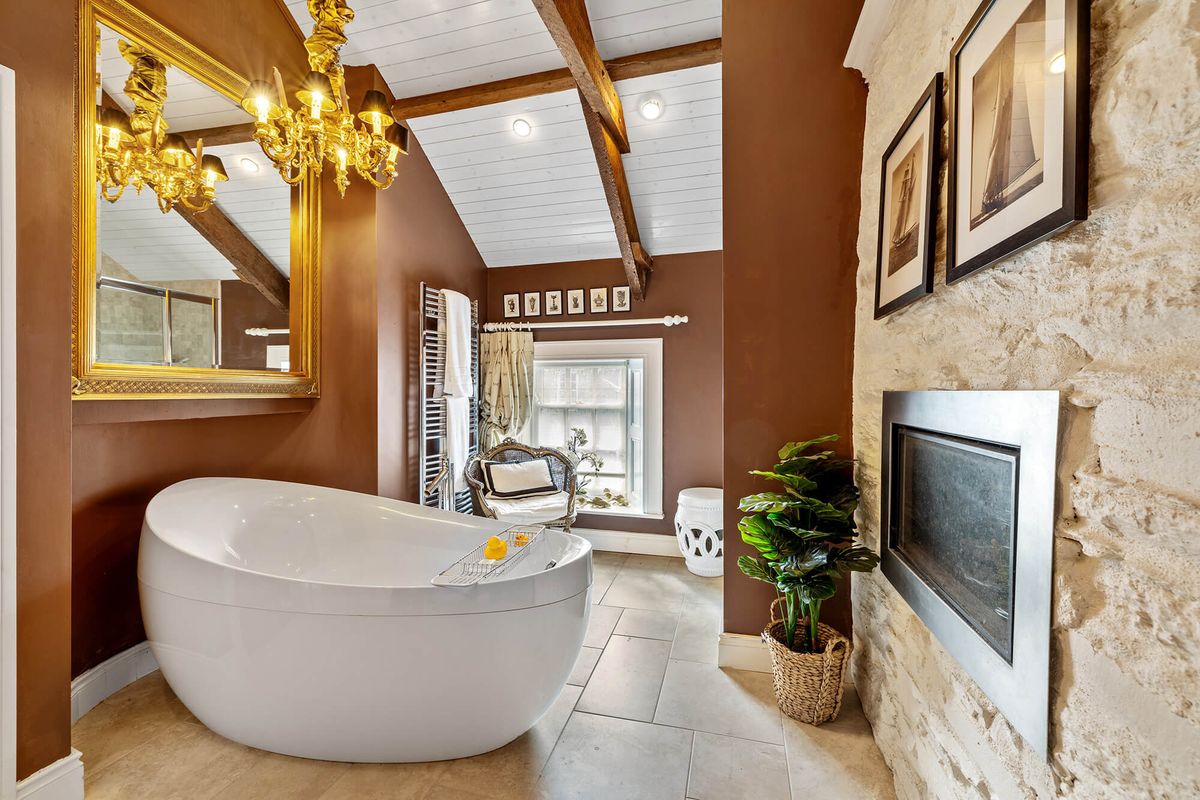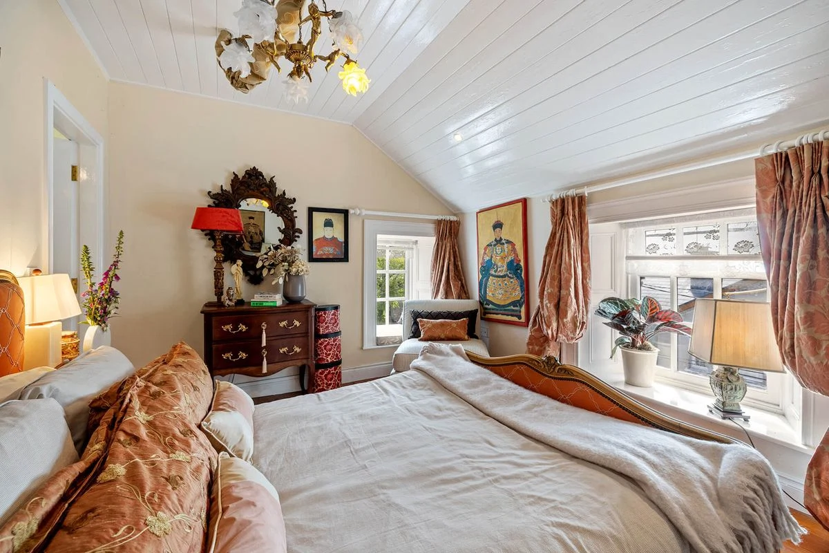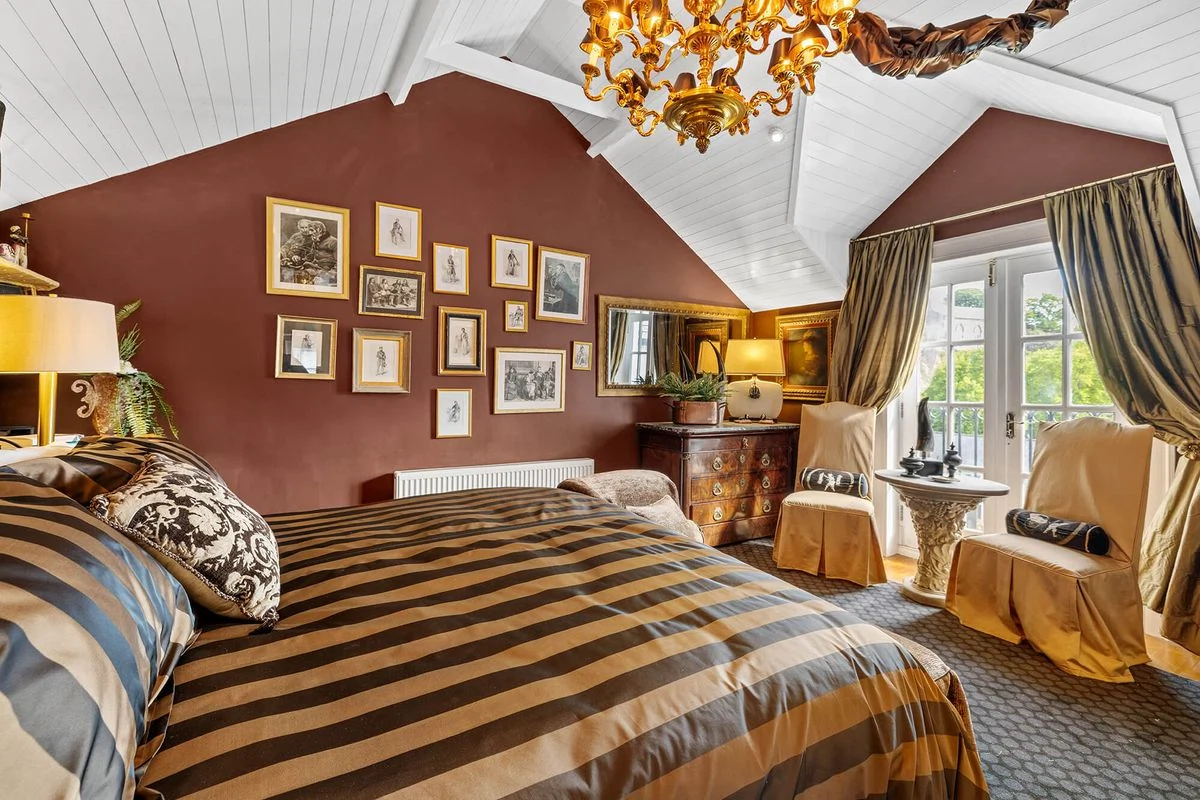 Outside, there is a large, landscaped garden with a stone wall on the street side, affording privacy. There is also a building at the end of the garden that can be used as a boathouse or garage.