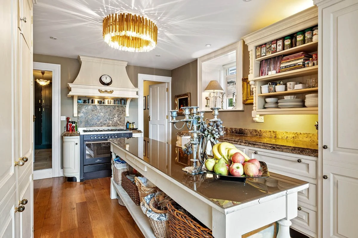 To the right of the hallway sits a second living space, both linking to the kitchen and dining room at the back of the house. The kitchen has hand-painted units, a Belfast sink, and granite worktops, while a door from the dining space leads out to a raised patio. There is also a utility room and WC off the kitchen.