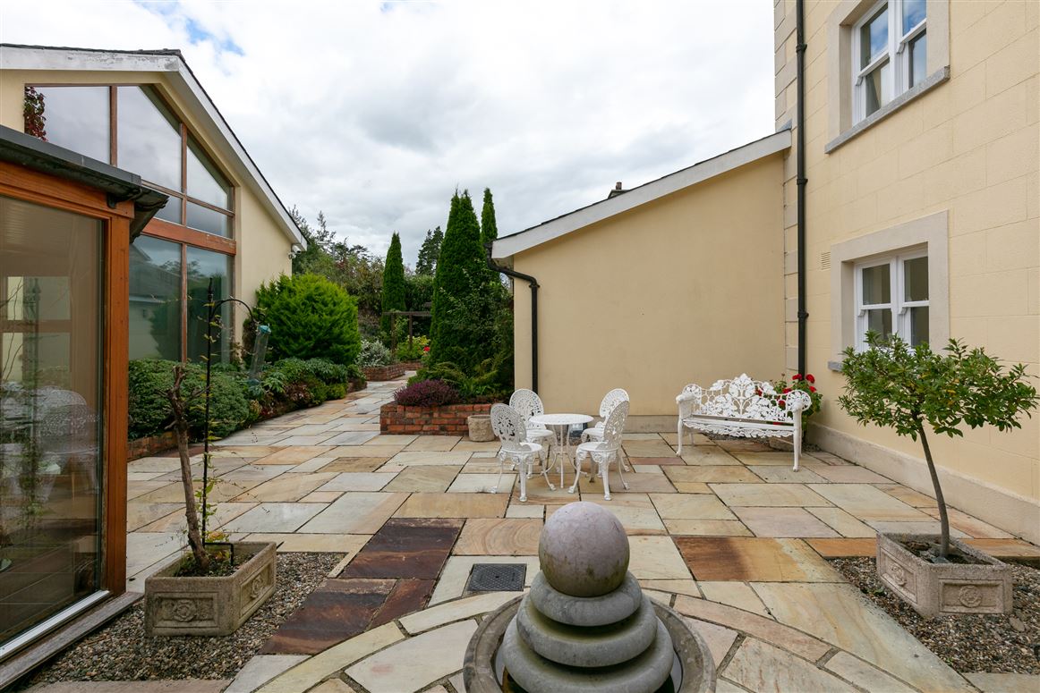 Outside, the grounds are full of mature trees and planting, and there is also an enclosed garden and a tennis court, while a large fountain is visible from the pool complex. There are four garages which include an office space and a car wash.
