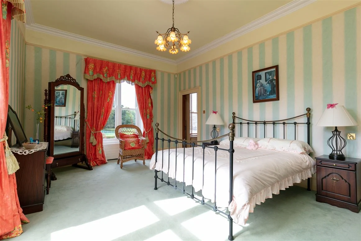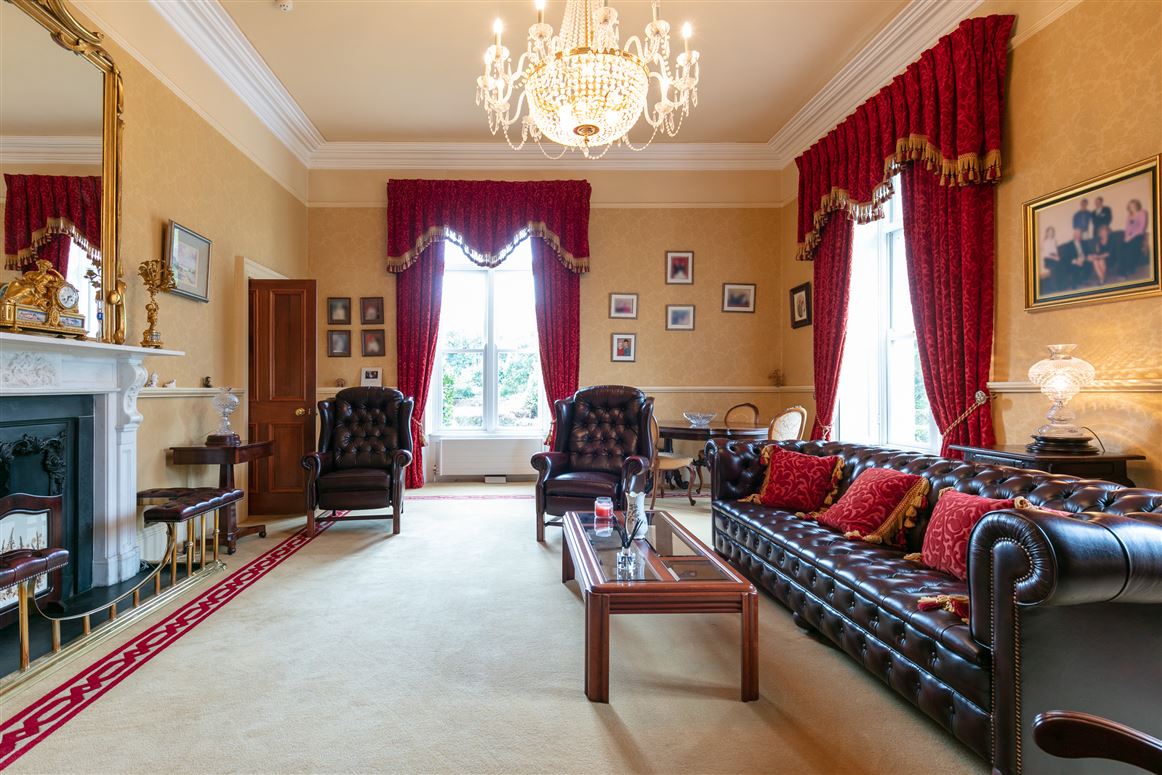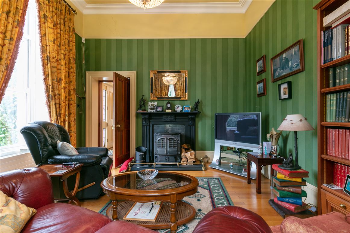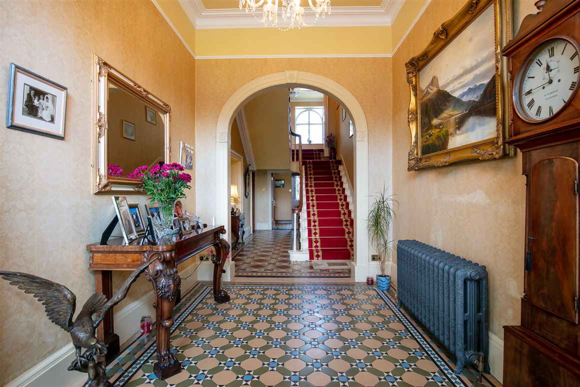 You enter the main house into a large hallway which has a decorative tiled floor, particularly high ceilings and a decorative archway and cornicing. Off this space are four grand rooms. The drawing room has a marble fireplace and large sash windows, while opposite sits the library.