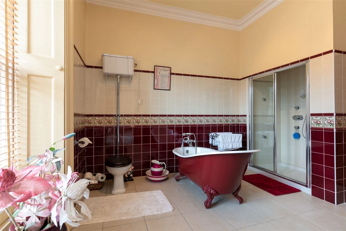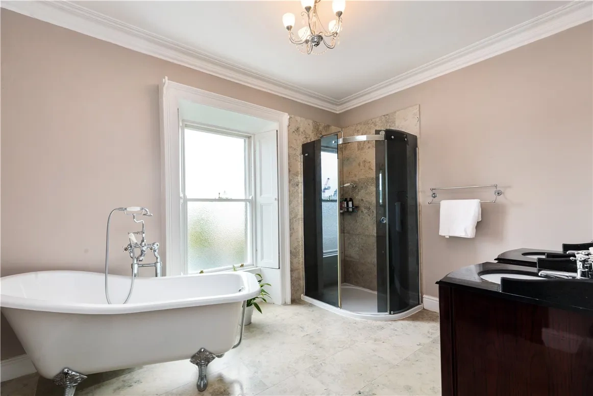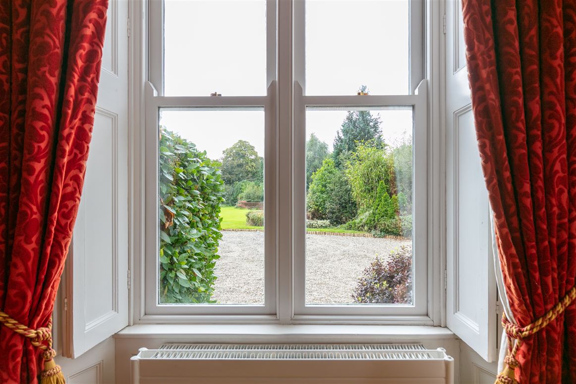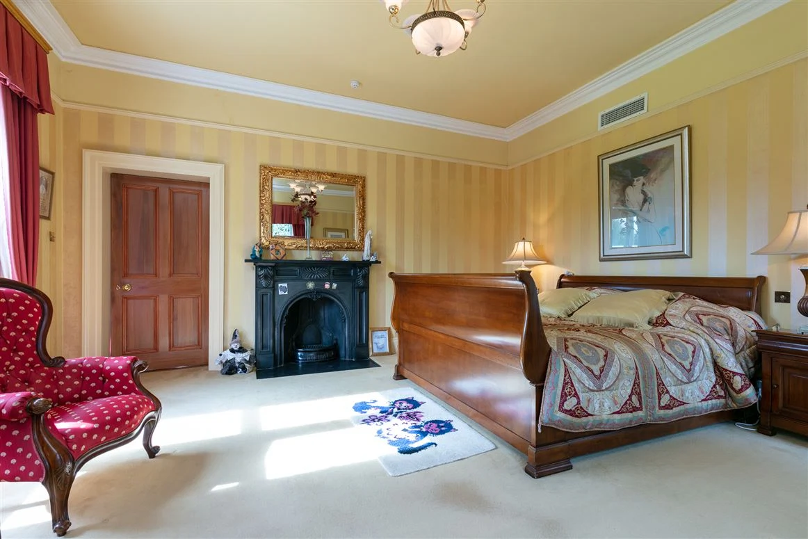 You enter the main house into a large hallway which has a decorative tiled floor, particularly high ceilings and a decorative archway and cornicing. Off this space are four grand rooms. The drawing room has a marble fireplace and large sash windows, while opposite sits the library.