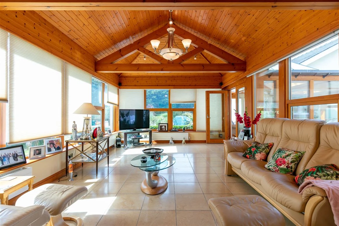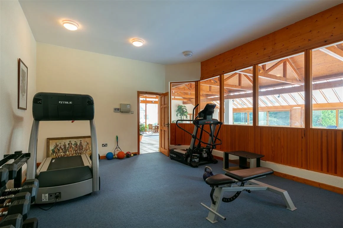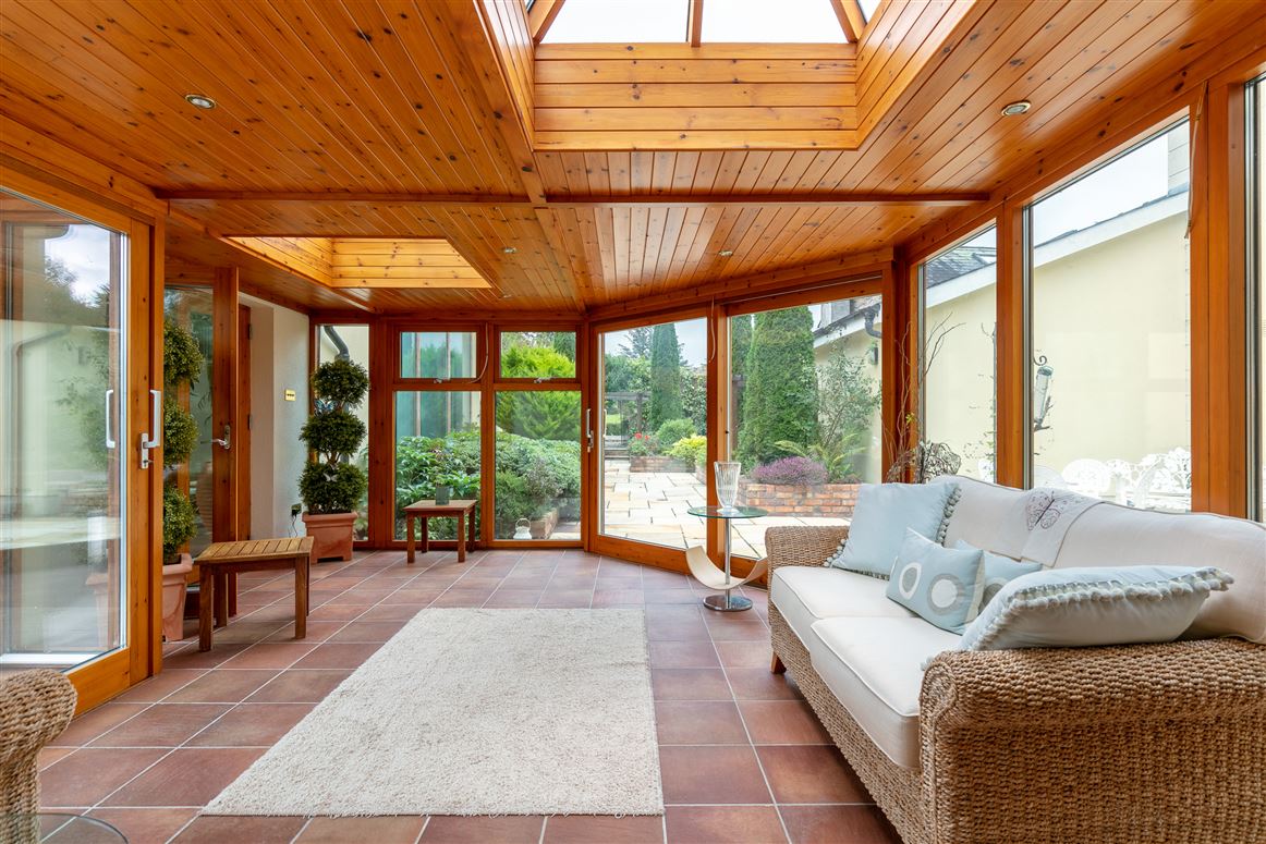 A sun room acts as the link between the original house and the large pool complex to the side. The swimming pool is tiled with steps, while there is also a jacuzzi and sliding doors to rear, as well as a changing room, sauna and gym space.