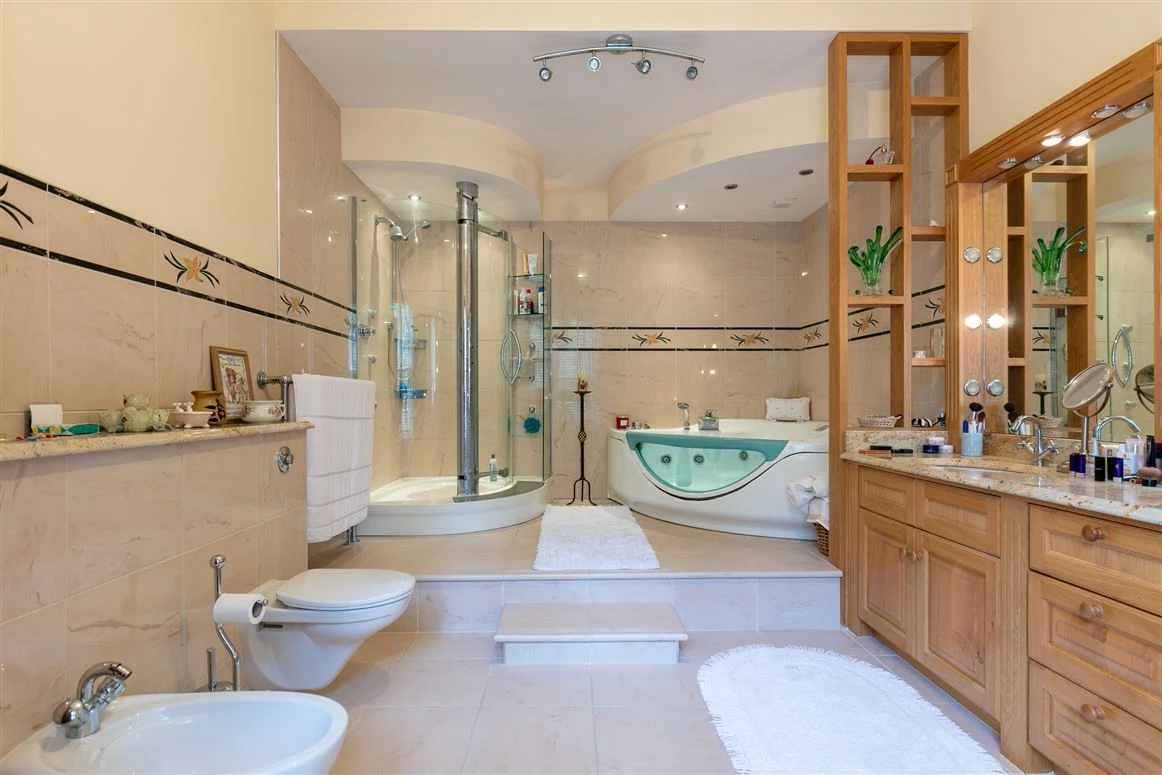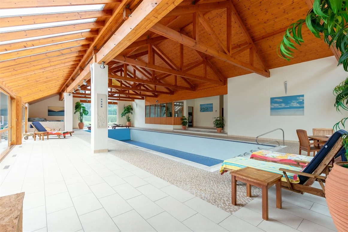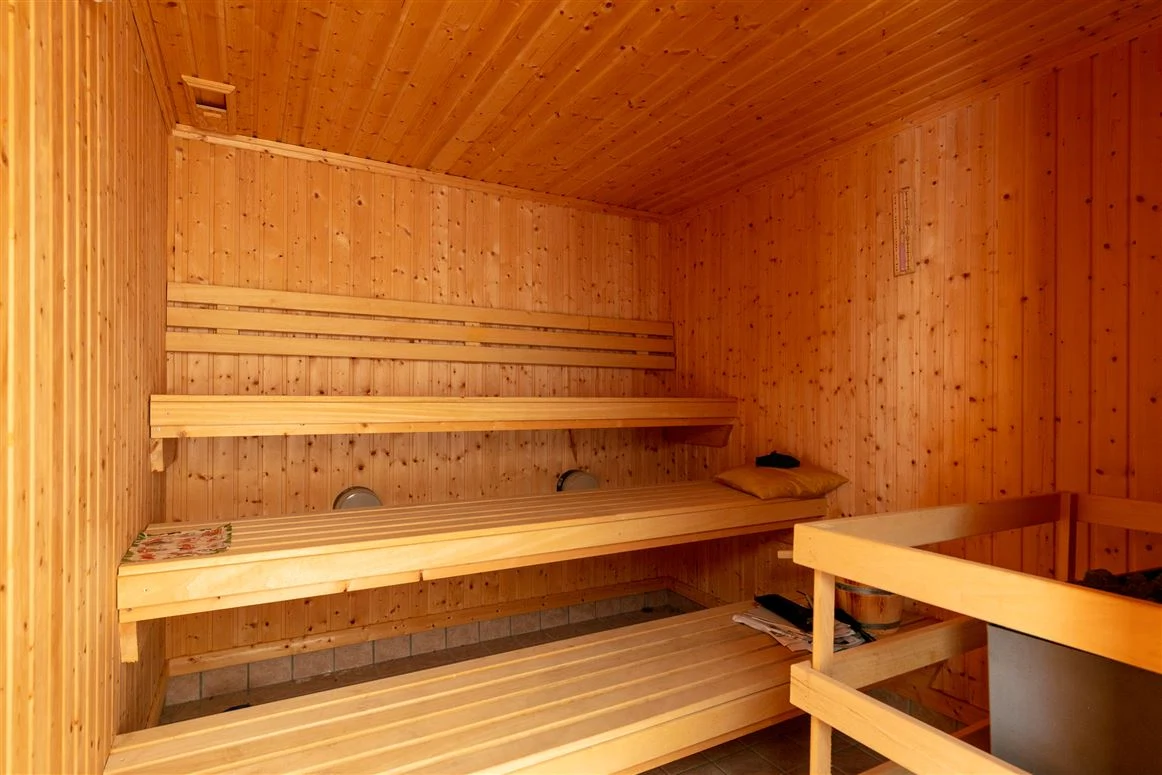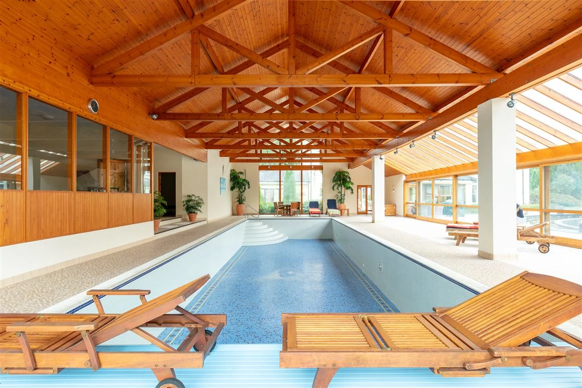 A sun room acts as the link between the original house and the large pool complex to the side. The swimming pool is tiled with steps, while there is also a jacuzzi and sliding doors to rear, as well as a changing room, sauna and gym space.