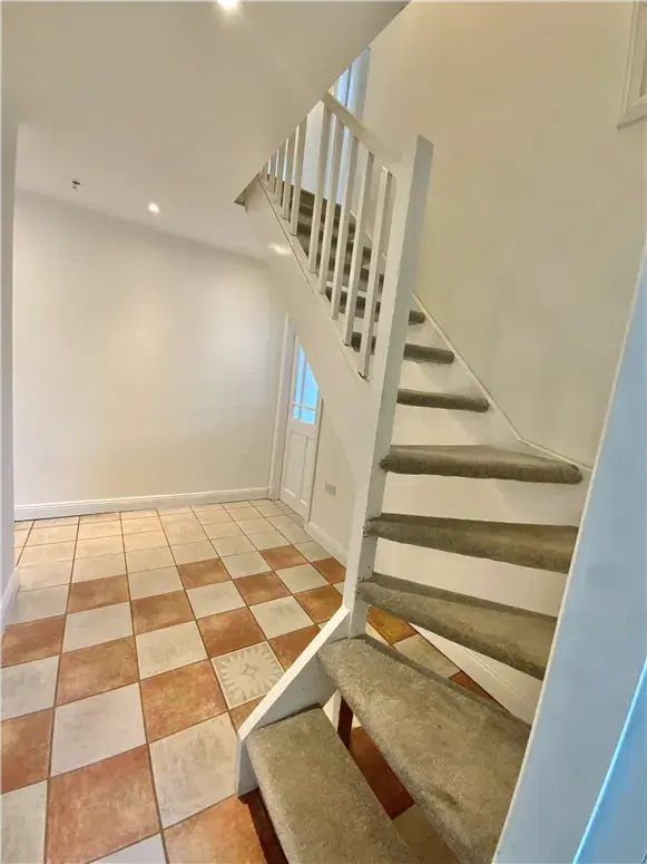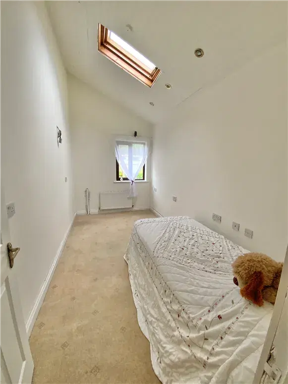 Internally, the property opens onto a tiled entrance hall, leading to a carpeted set of stairs. The first bedroom — on the ground floor — has a carpeted floor, recessed lighting, and a skylight. There is also a bathroom on this level, with a bath, WC, sink, tiled mirror and shaver light point.