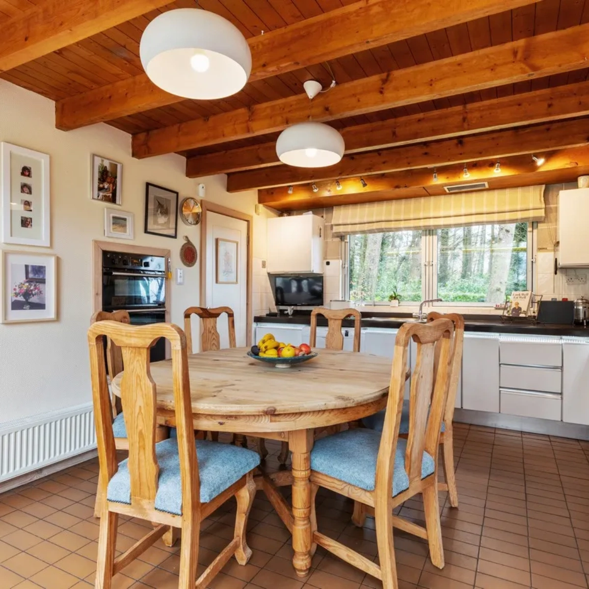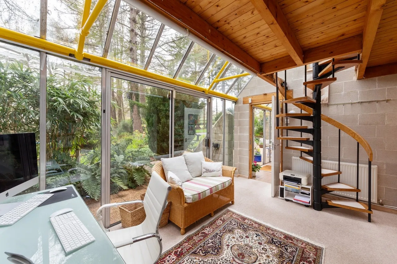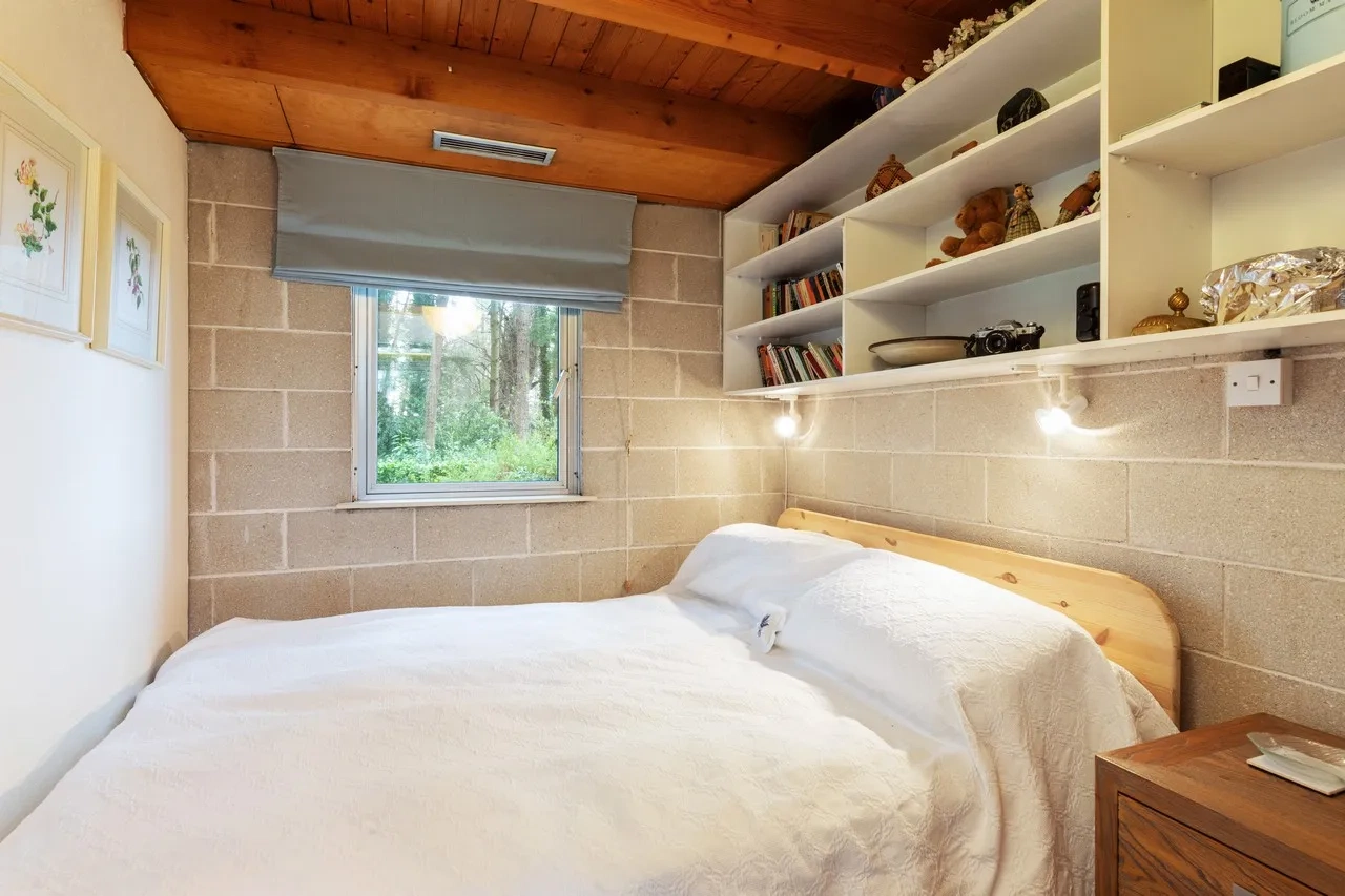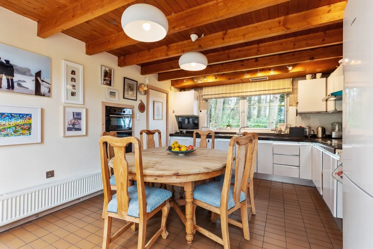 The glass-fronted kitchen/dining room opens into a connecting utility room with an under-stair storage area. A generous living room with a solid wood-fired stove completes the ground floor. The bedrooms on the ground floor would be easy to reconfigure into bigger bedrooms or adjoining dressing rooms, depending on new owners’ needs.