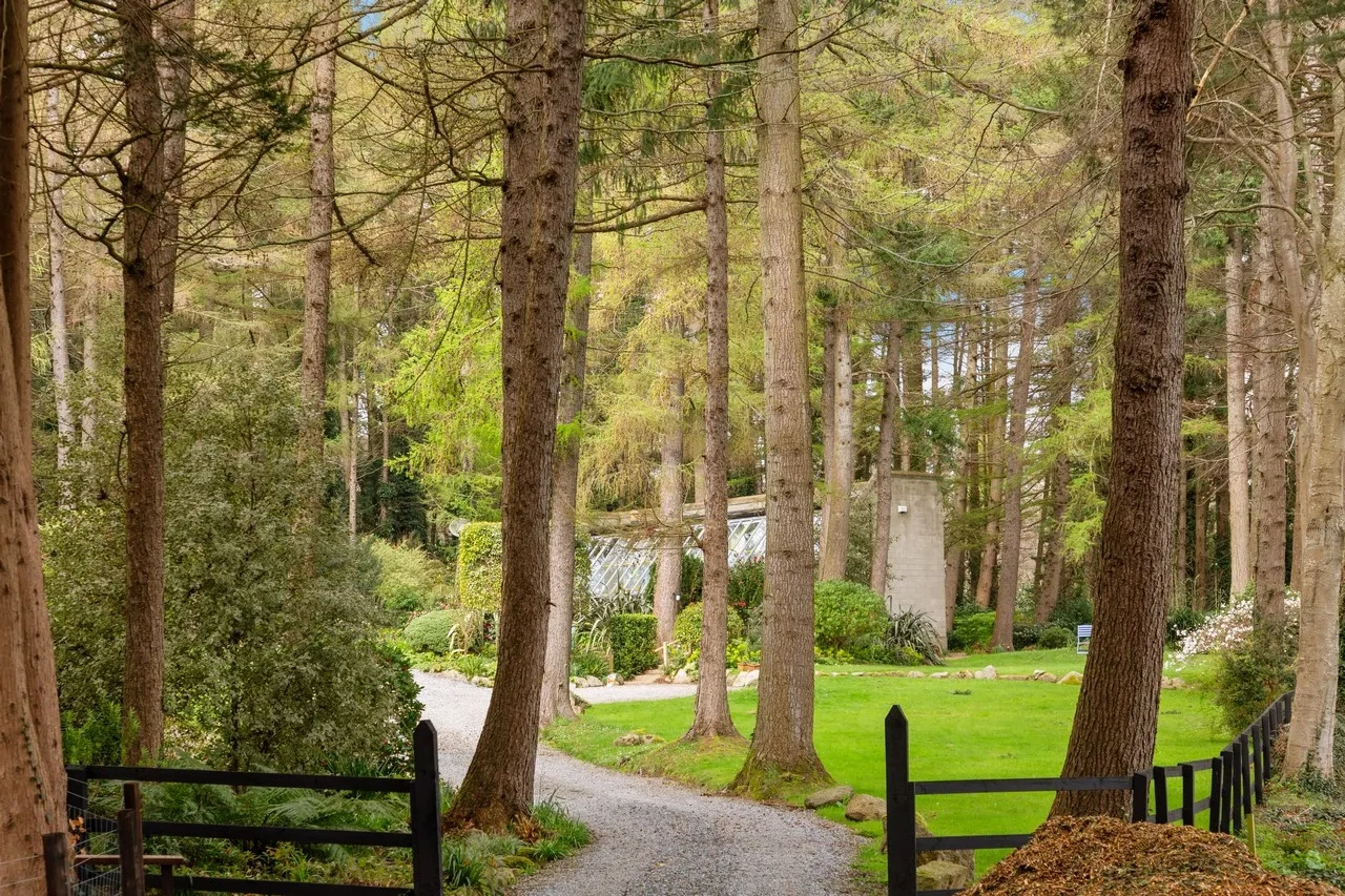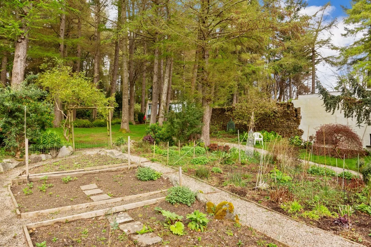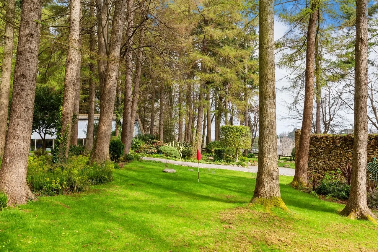 All the ground floor rooms open to a spacious sheltered south-facing terrace overlooking the grounds and the Sugar Loaf mountains. The property sits on 1.3 acres of lush gardens and features mature woodland and multiple lawns lined with an array of colourful shrubs and a small stream. To the east, there are stunning views across open fields. There is also a dedicated fruit, flower, and vegetable garden.