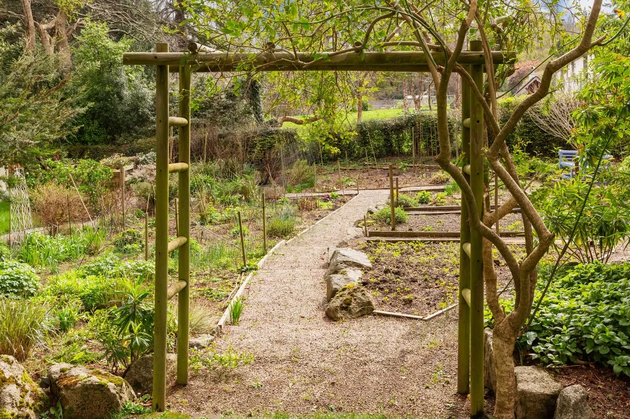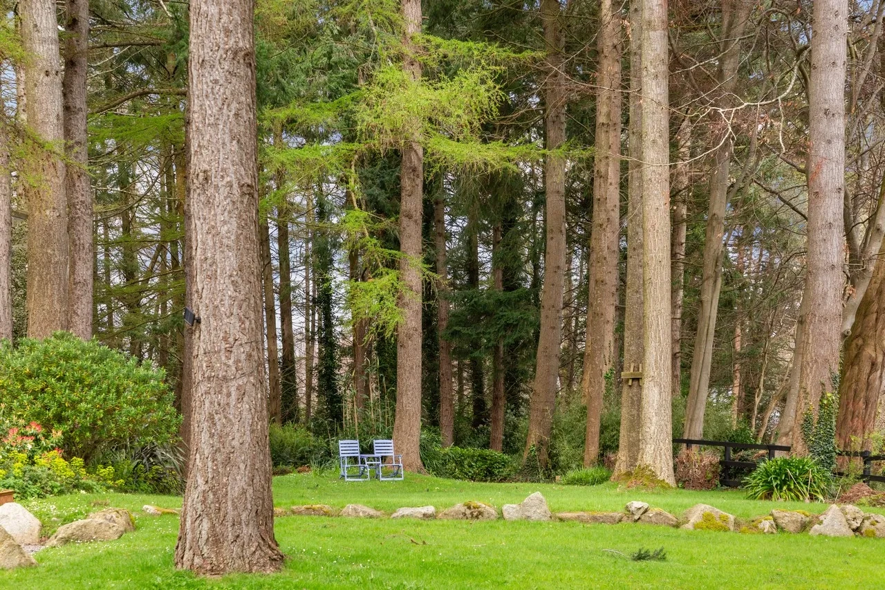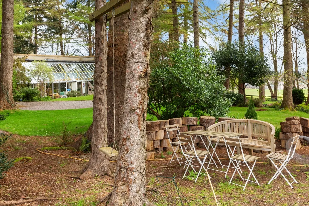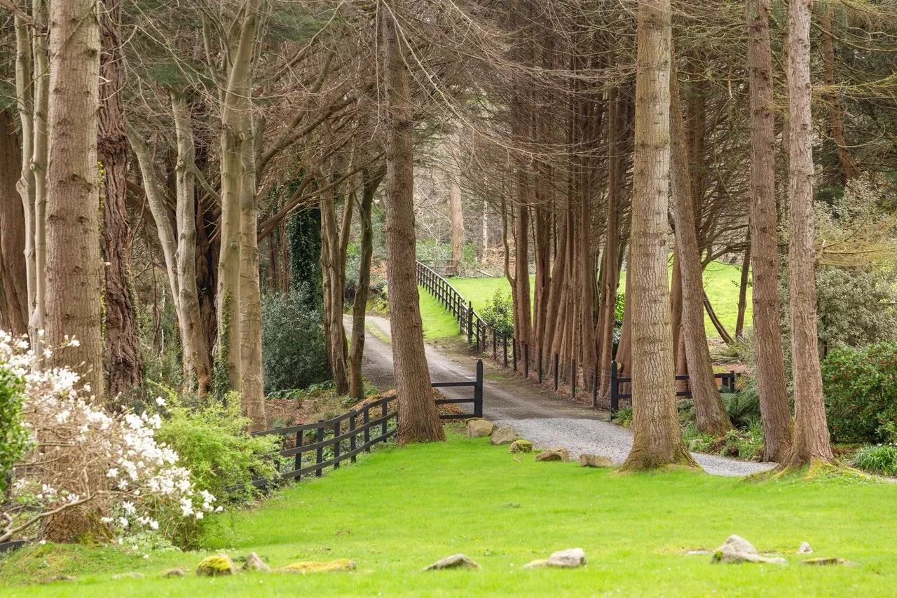 All the ground floor rooms open to a spacious sheltered south-facing terrace overlooking the grounds and the Sugar Loaf mountains. The property sits on 1.3 acres of lush gardens and features mature woodland and multiple lawns lined with an array of colourful shrubs and a small stream. To the east, there are stunning views across open fields. There is also a dedicated fruit, flower, and vegetable garden.