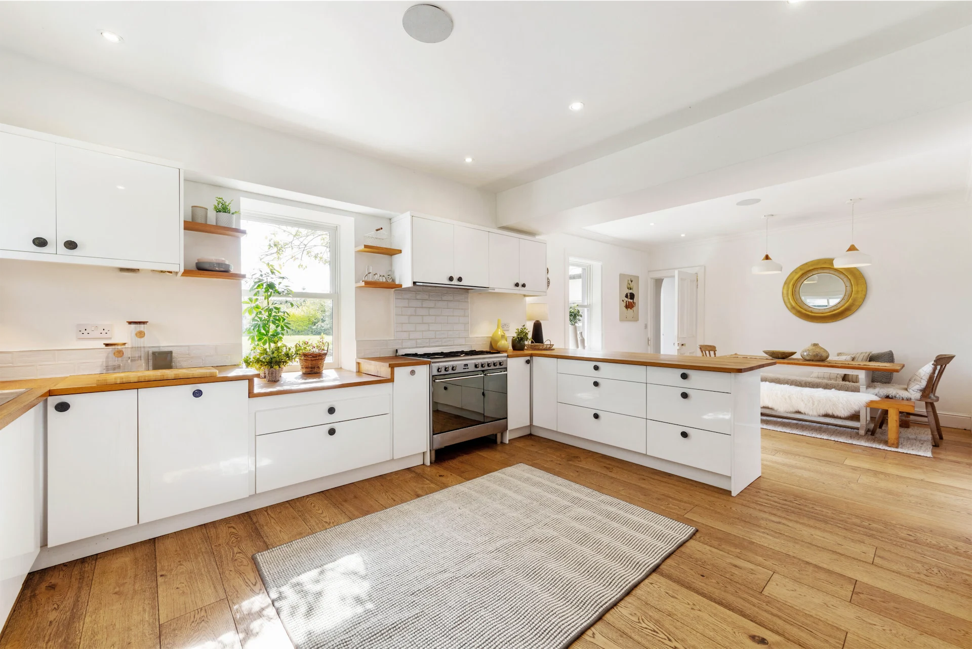 The heart of the home is the spacious open plan kitchen, which boasts contemporary fittings and top-of-the-line appliances. The solid oak plank flooring and stylish wall mounted units combine to create a culinary haven that is perfect for both intimate dinners and large gatherings.