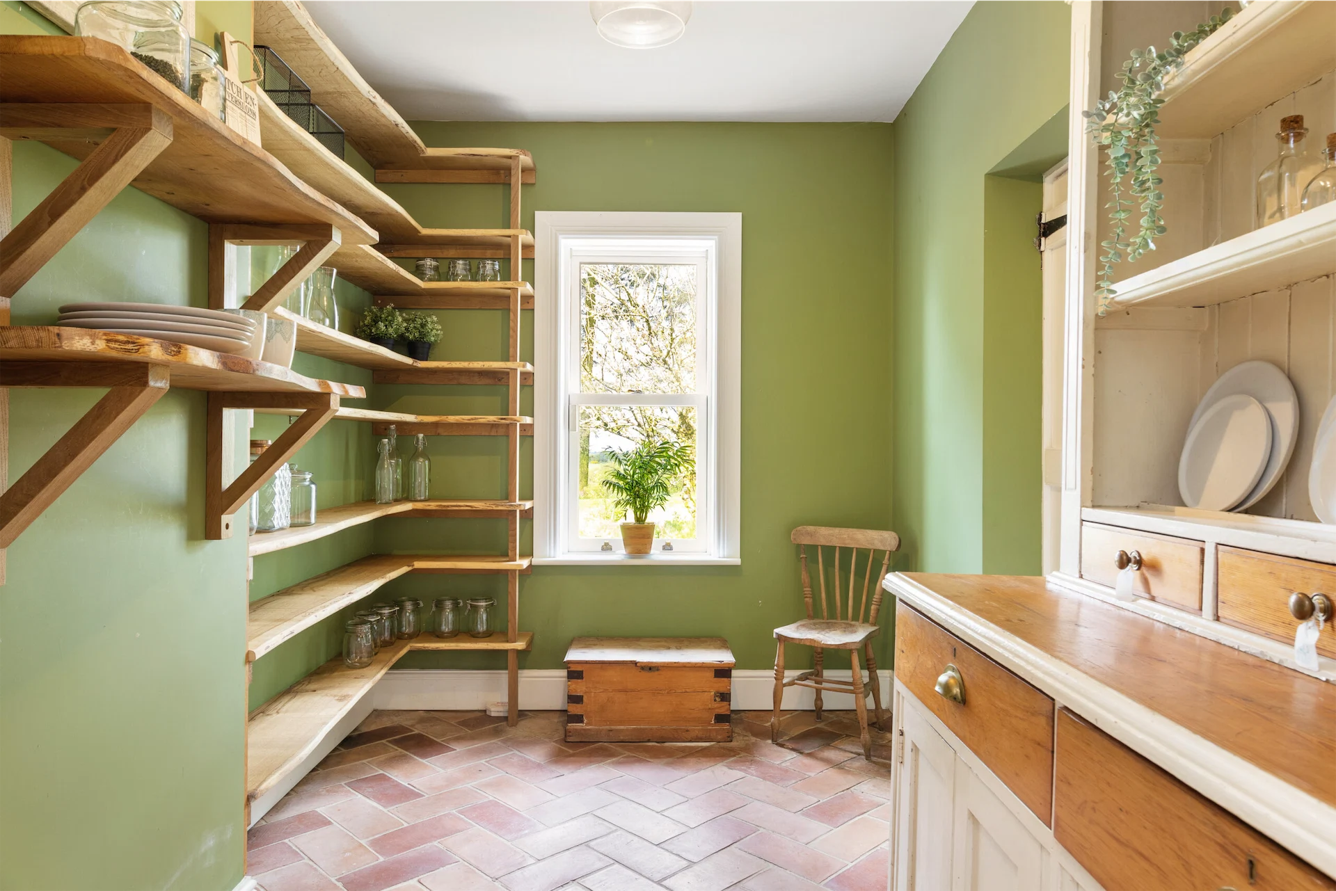The utility room is a charming addition, with its rustic Belfast sink and terracotta tiles that add a touch of character to the space. The open-shelved solid oak pantry is a must have, providing ample space for storing your favourite ingredients and cooking utensils.