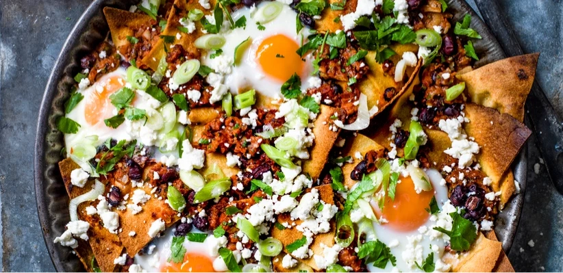 Think sophisticated breakfast nachos, this delicious oven bake is made of tortilla chips topped with eggs, salsa, black beans and feta cheese. Recipe from Olive Magazine.