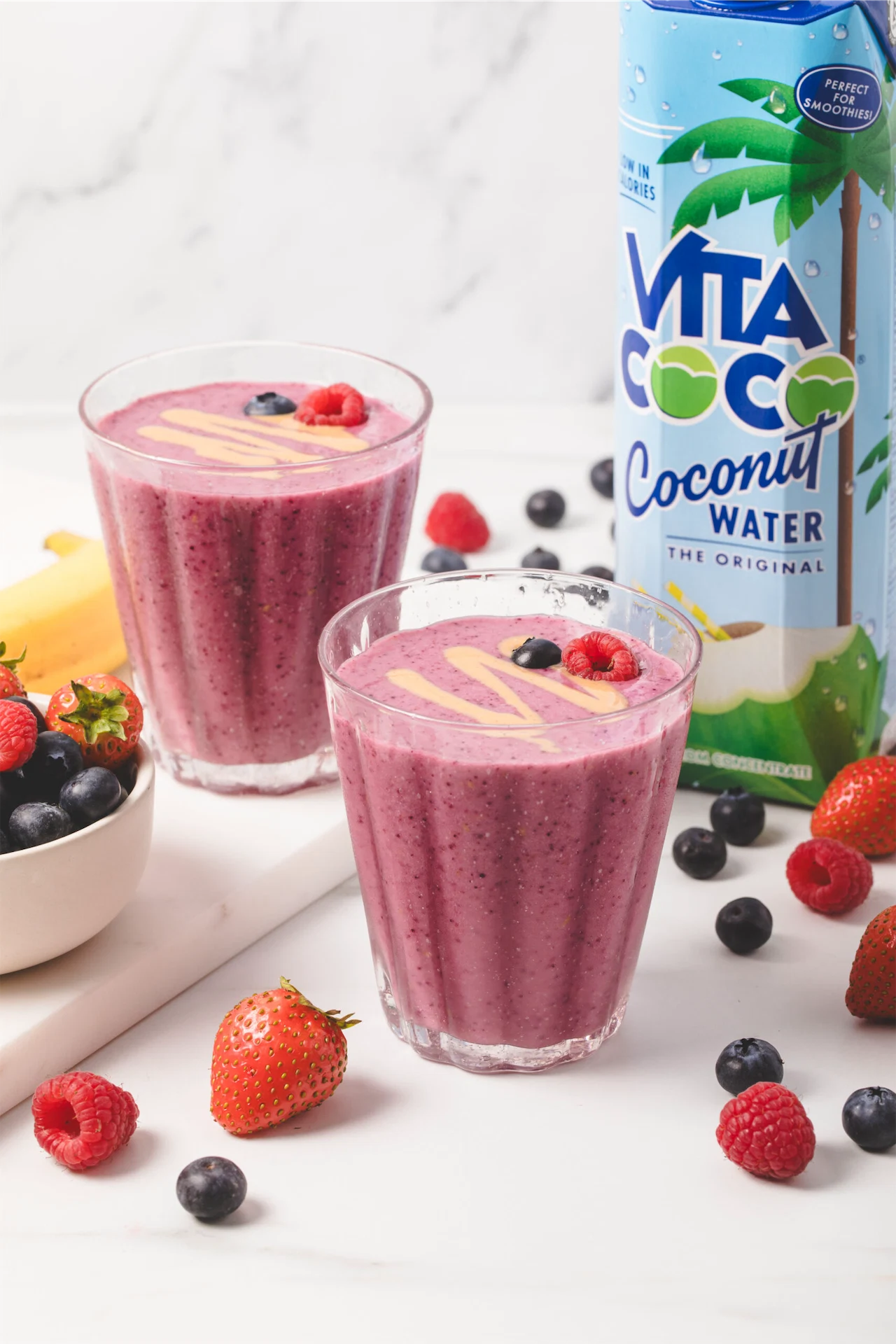 I am a recent convert to protein smoothies, and am loving them! I make myself one every afternoon around 3 or 4pm and find it really helps to fill the gap and keep me going between meals, helping to avoid the starchy carb-heavy choices I would make otherwise. Through experimentation, I have discovered that the secret ingredient – for me – is Vita Coco Coconut Water. I don’t like the taste of milk so I make my smoothie on a base of coconut water (200ml), then add fresh blueberries, fresh spinach leaves, a sprinkle of seeds, a handful of frozen red berries and a scoop of whey protein. The coconut water adds a lovely creaminess to the smoothie, making a healthy snack taste much more decadent and delicious than it should.