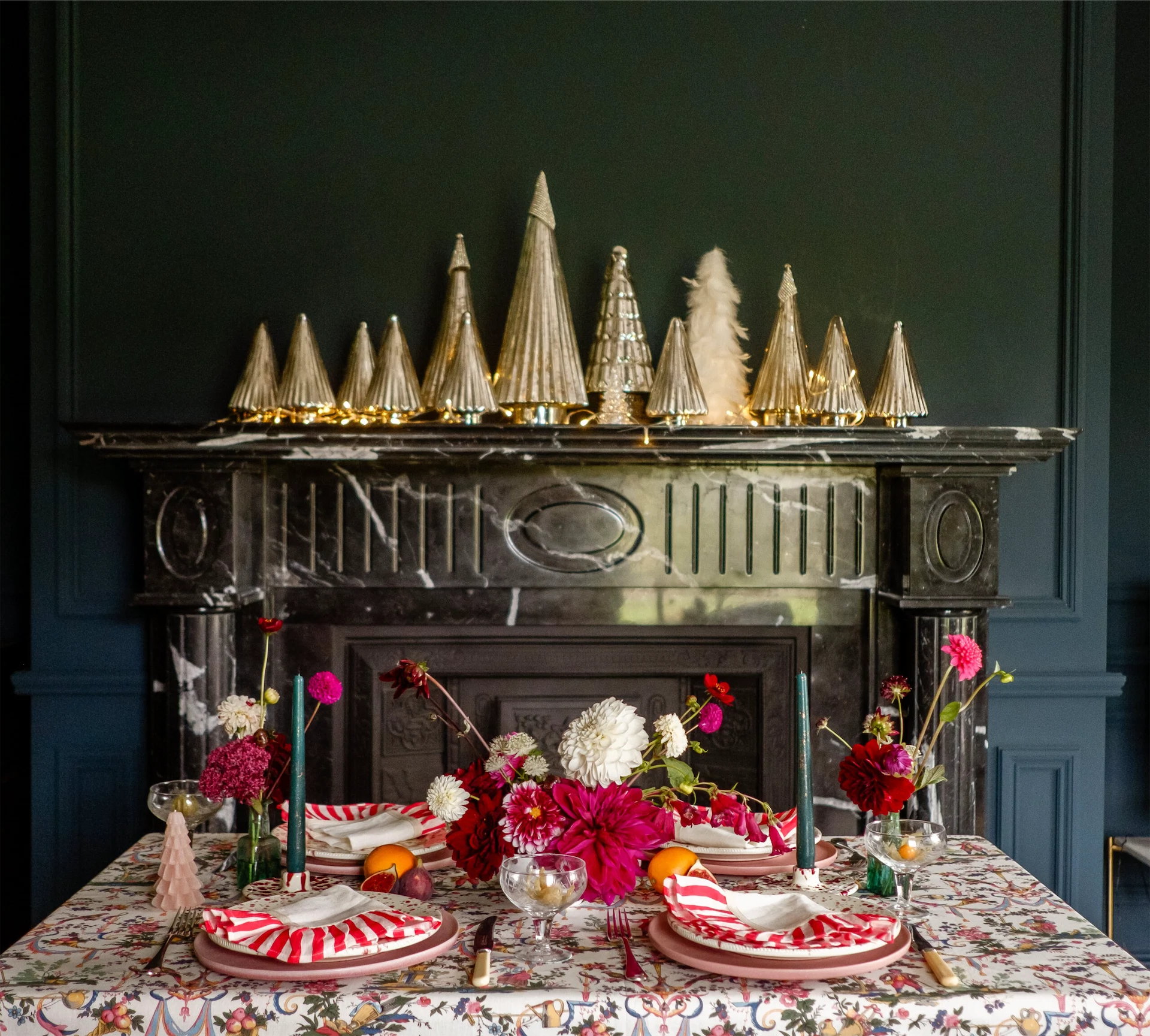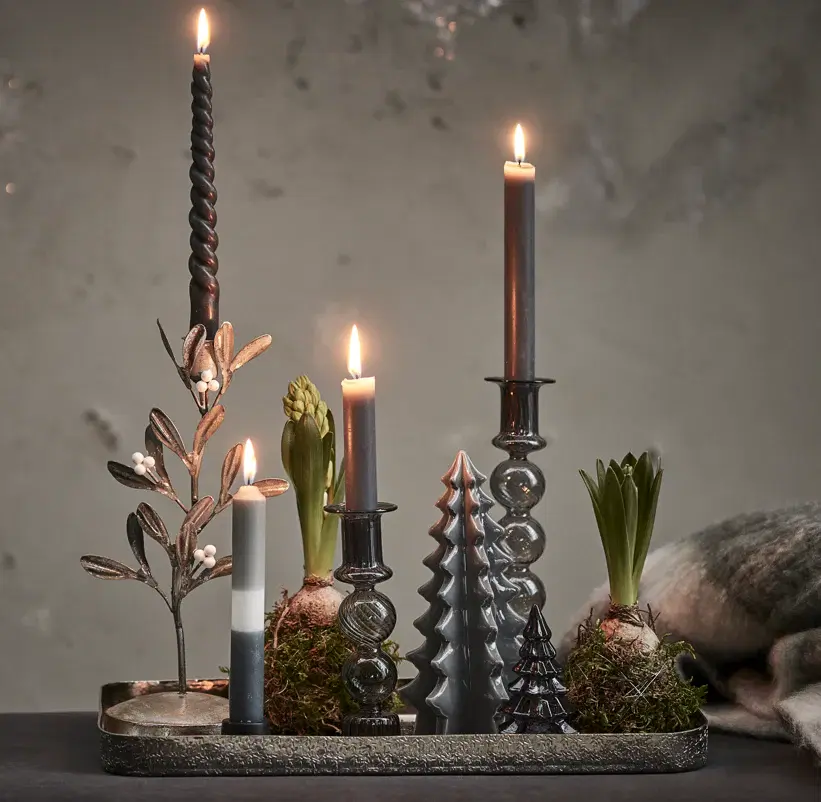 Lighting is also an important element of her festive decor. “I make it a ritual to light up the rooms with the soft glow of candles and lanterns dotted around on gold trays. Personally curating the festive vibe, I love dressing the mantelpiece and dining table with fresh foliage and tall tapered candles.”