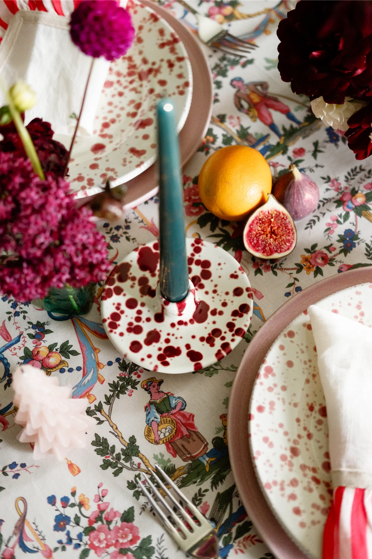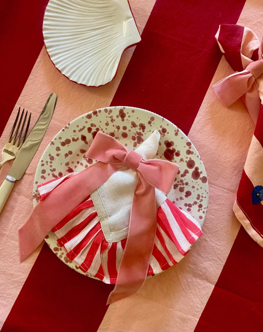 The table is a focus for Amber at this time of year. “Eating with family at Christmas is an occasion to be celebrated and cherished so it’s all about going big and making a fuss because, why not?” This year, she’s loving ruffles, velvet bows, candy cane stripes, and Italian spatterware.