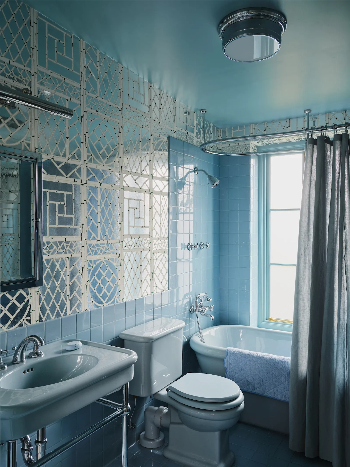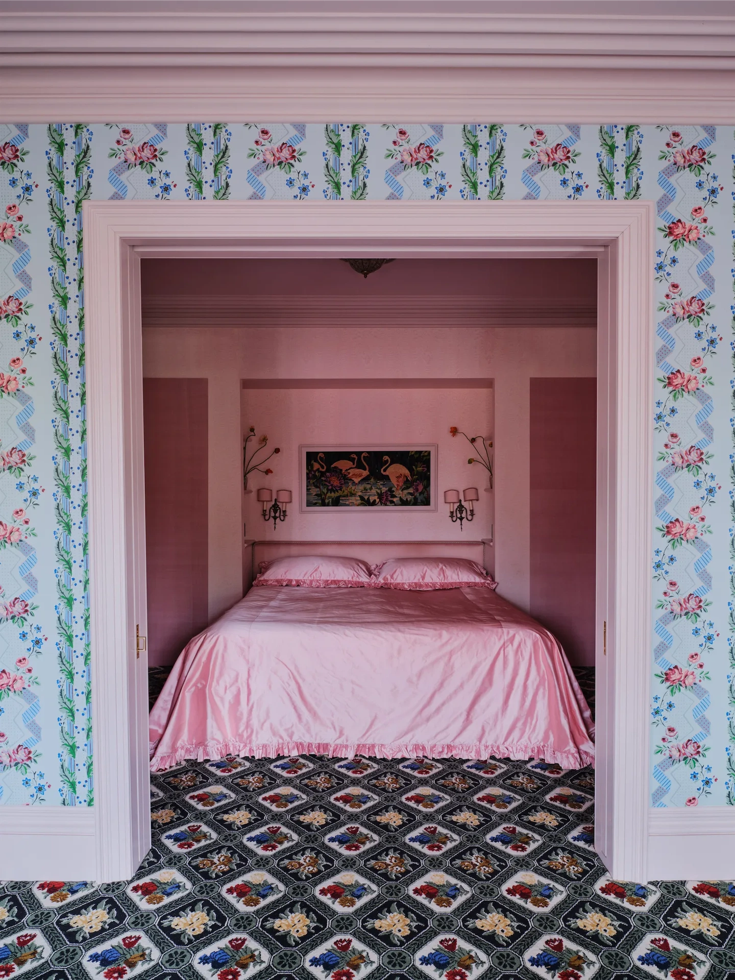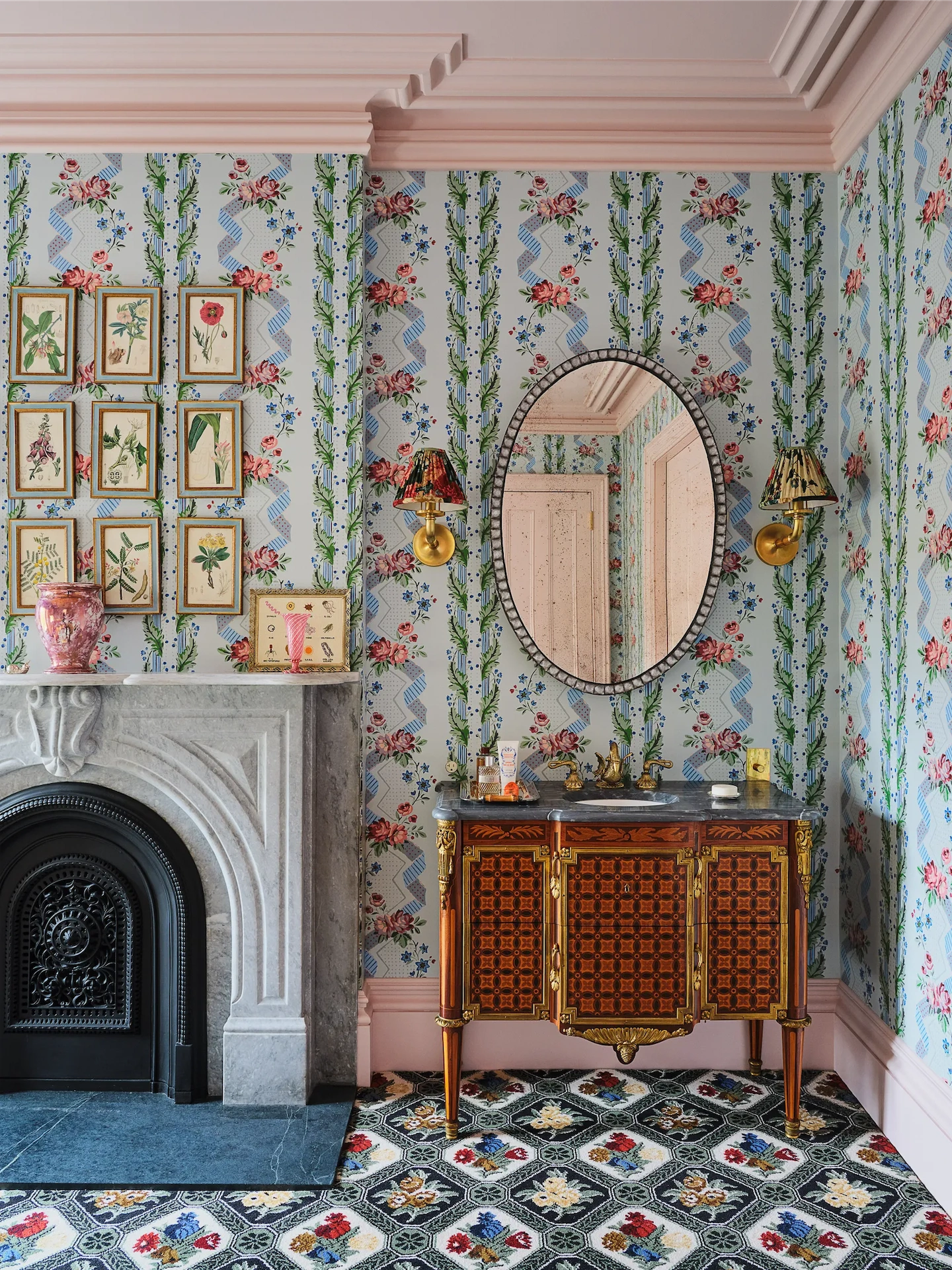 Setting about preserving the character of the space while making it entirely their own, they chose to embrace the atypical layout of the property and lean into extravagance in every meaning of the word. Yes, we’re talking about the bath-cum sitting room on the second floor, complete with a wall-to-wall floral carpet, Louis XVI–style sink stands, and sculptural freestanding tub.