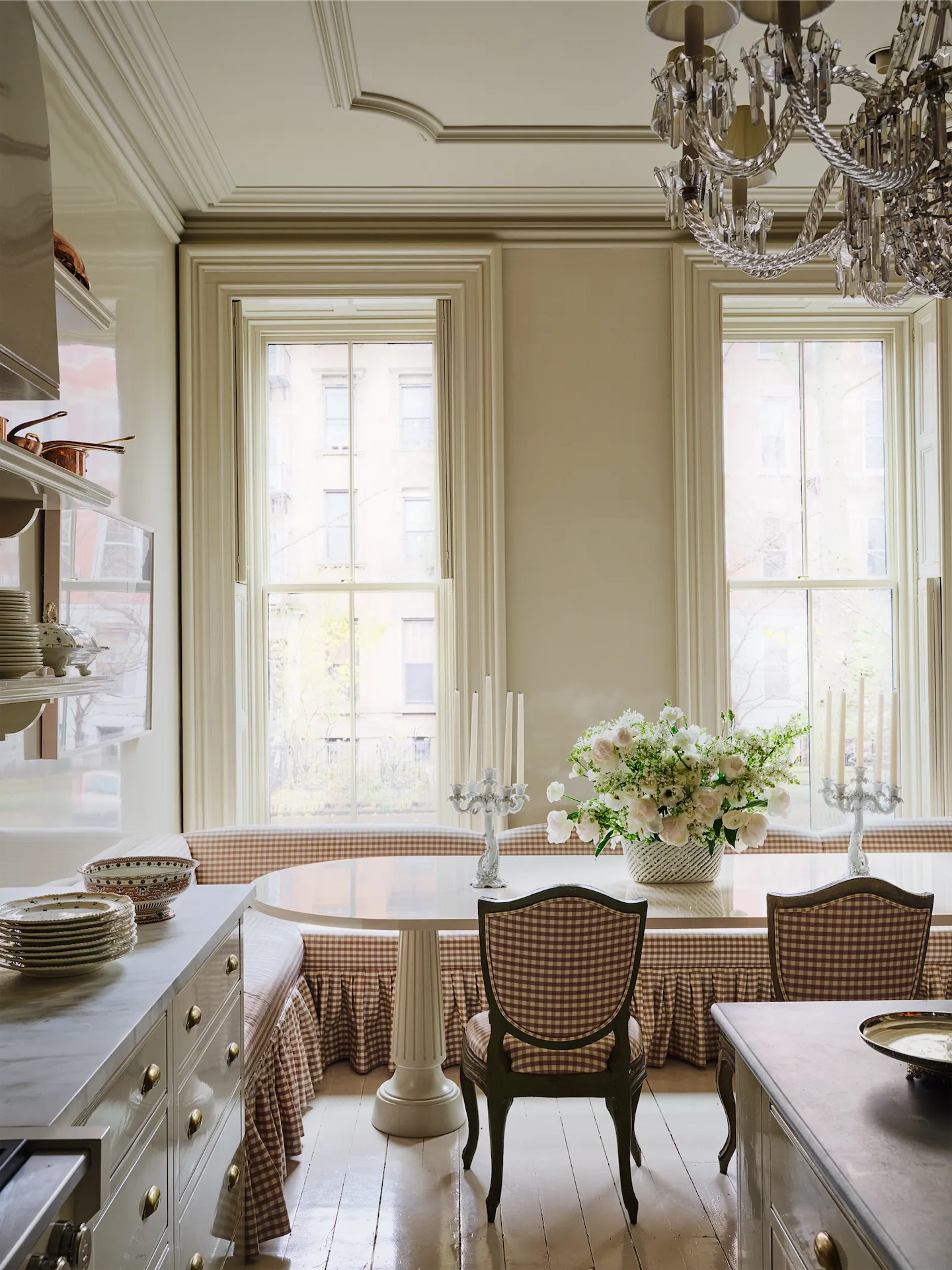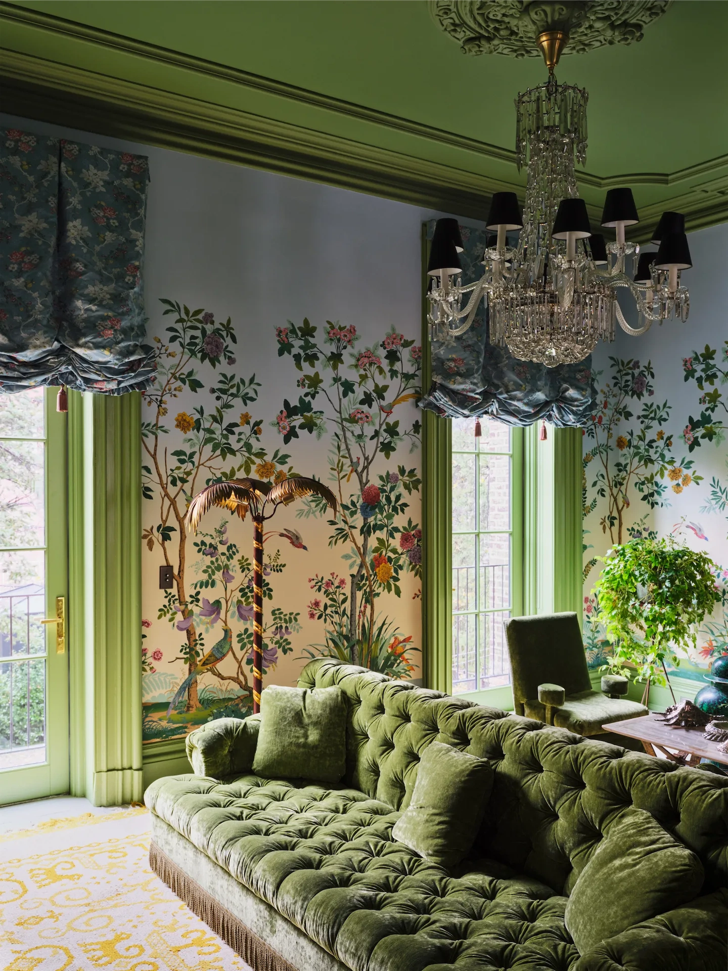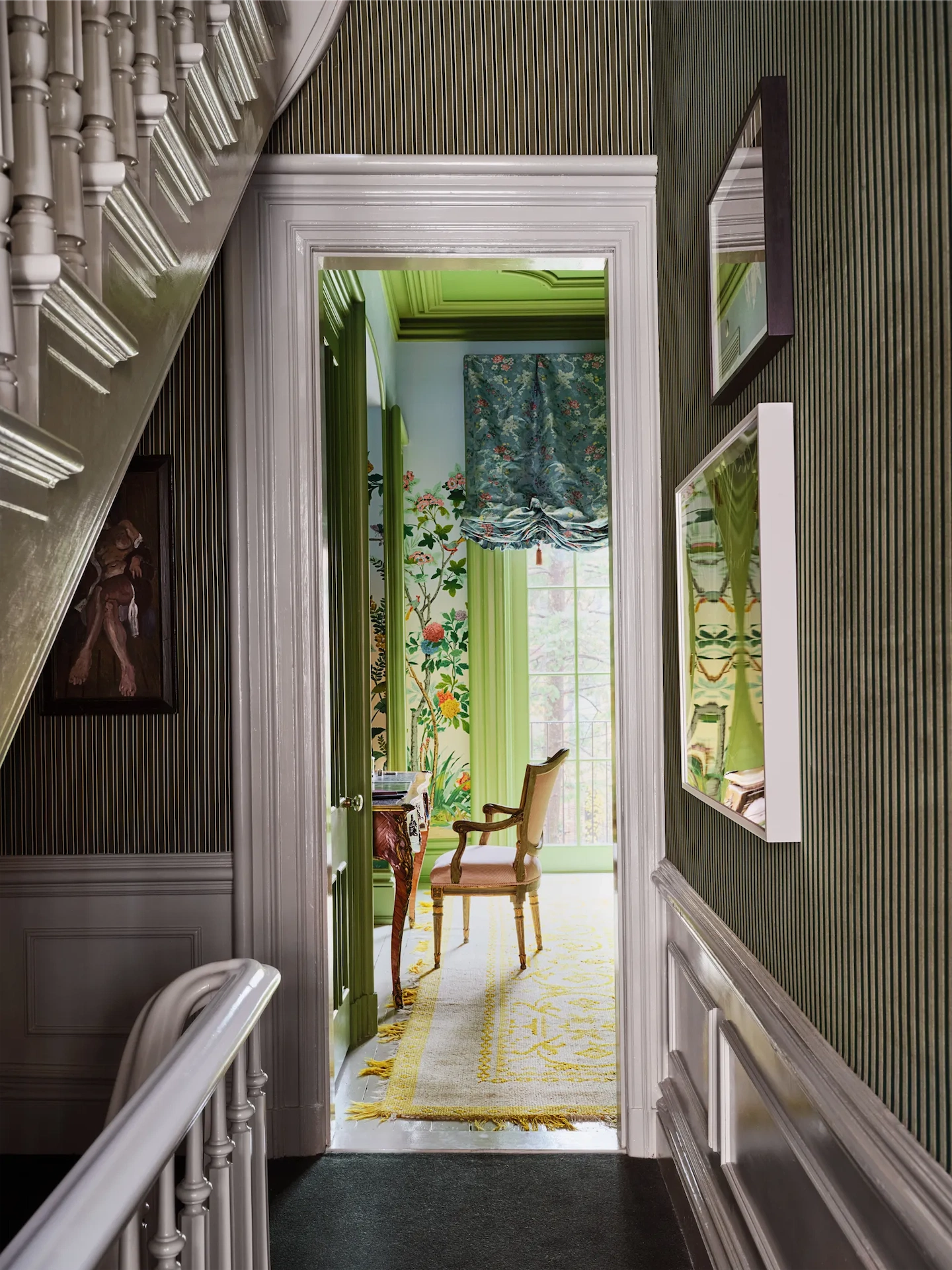 Setting about preserving the character of the space while making it entirely their own, they chose to embrace the atypical layout of the property and lean into extravagance in every meaning of the word. Yes, we’re talking about the bath-cum sitting room on the second floor, complete with a wall-to-wall floral carpet, Louis XVI–style sink stands, and sculptural freestanding tub.