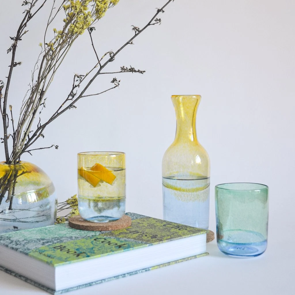These beautiful carafes and beakers are handblown at the Jerpoint workshop in Thomastown, Co Kilkenny, and will add a wonderful touch of brightness to your table.
