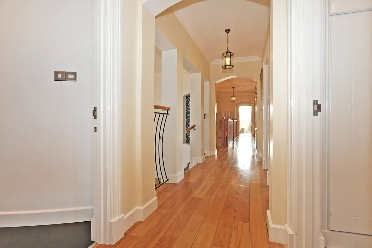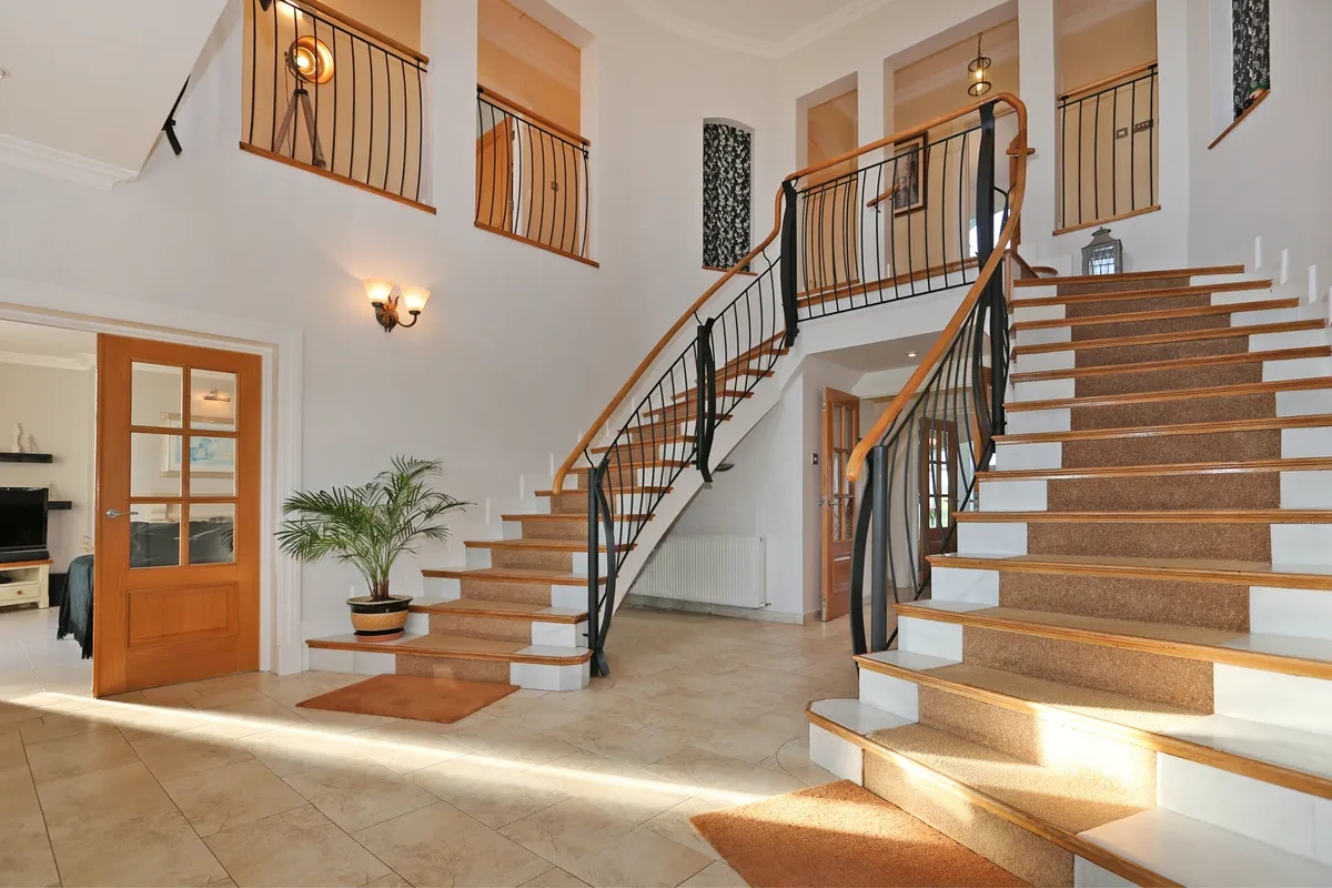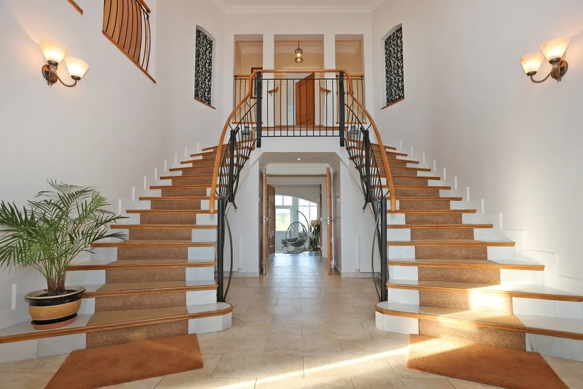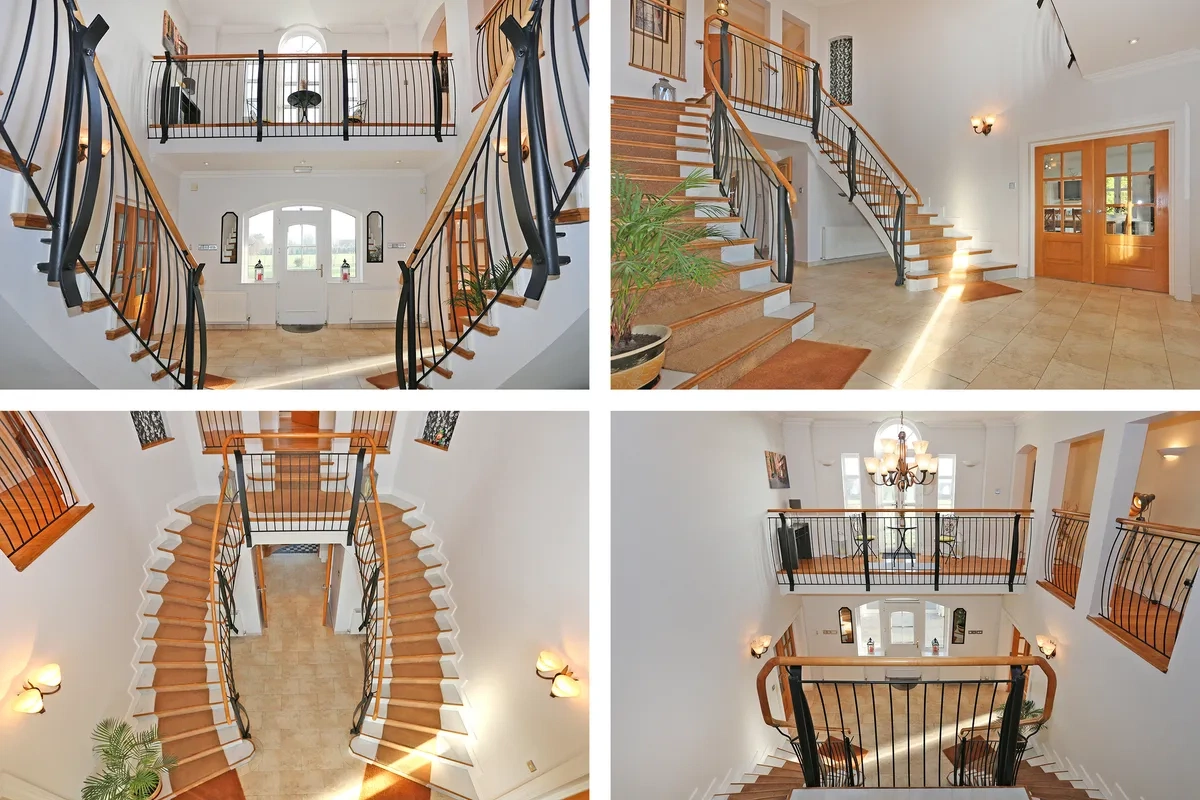 Bright and spacious throughout, the front door opens onto an entrance foyer with a wrap-around balcony and twin stairs. The living room is located to the left, while the dining room is to the right, there are double doors to the main hallway which provide access to the remainder of the living space at ground floor.