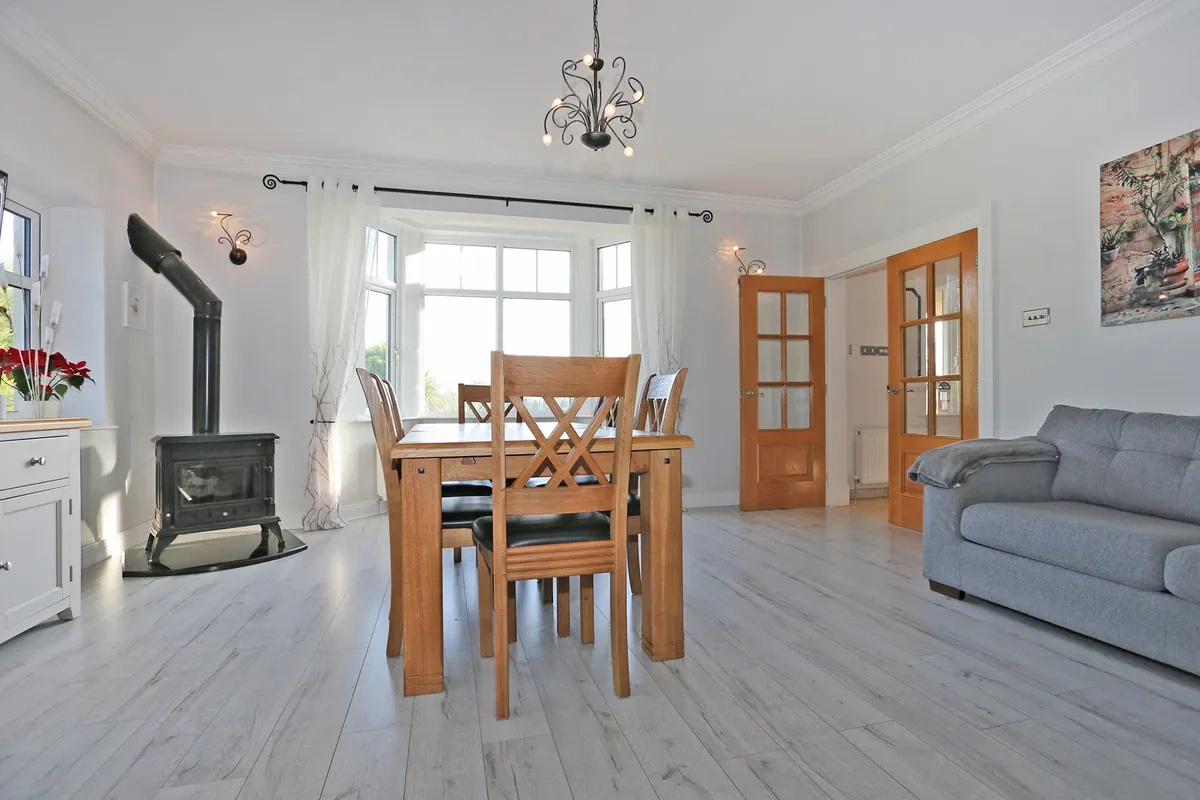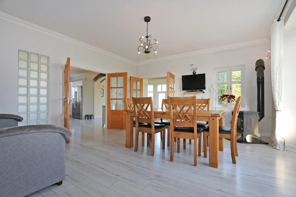 Located to the right of the foyer is the dining room with a bay window overlooking the front paddock. A free-standing stove takes pride of place in this room. The sunroom can be accessed from the dining room.