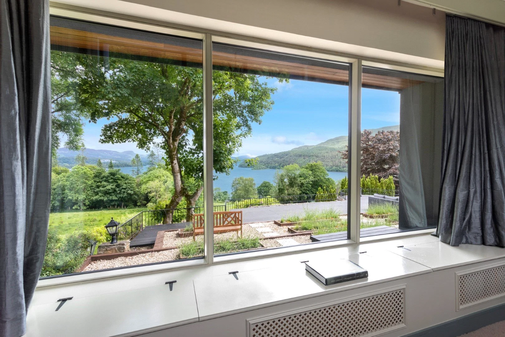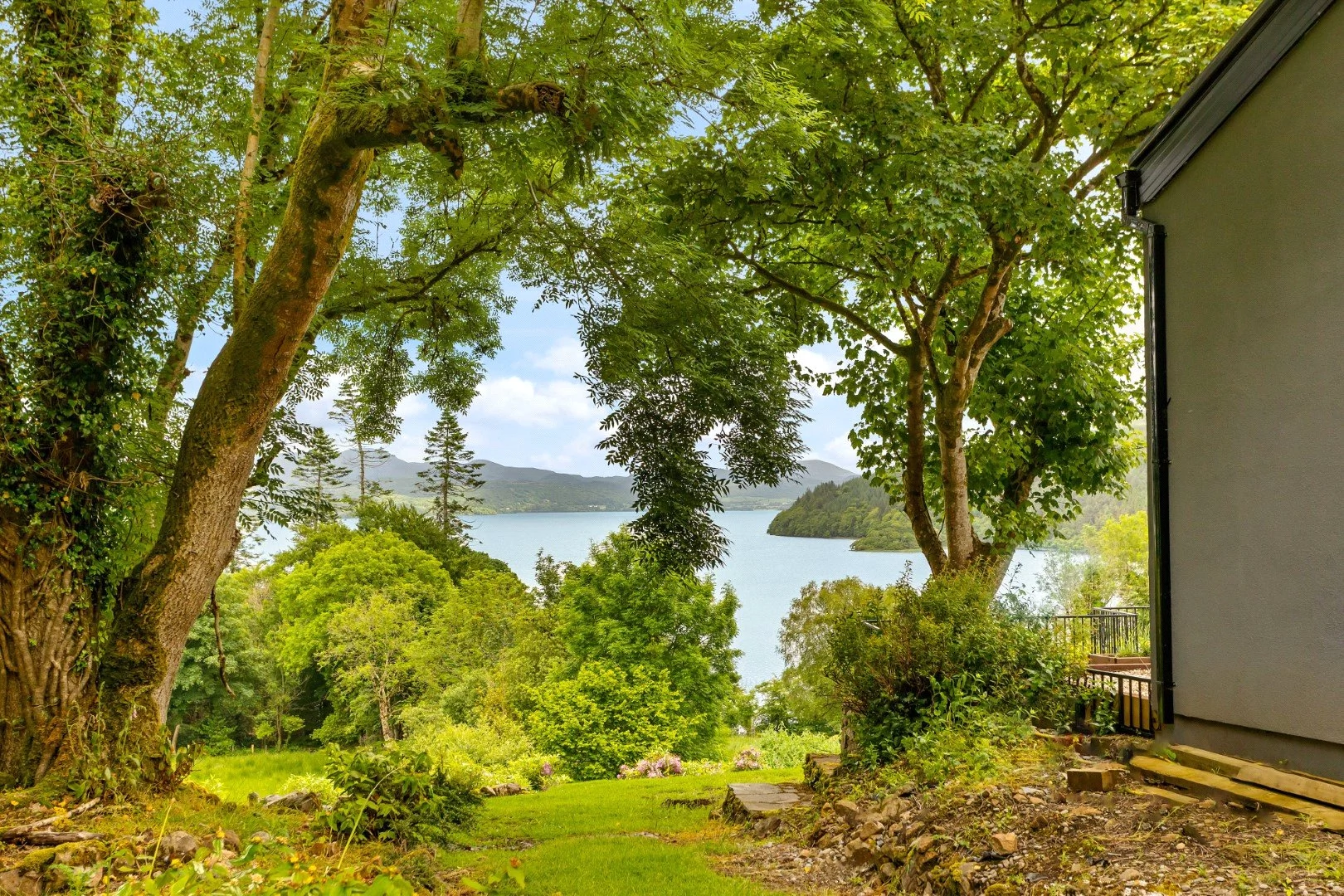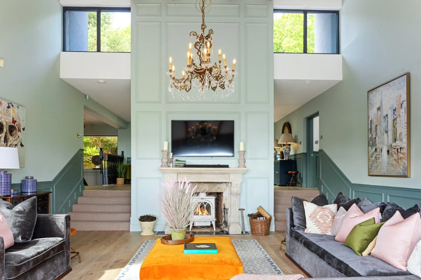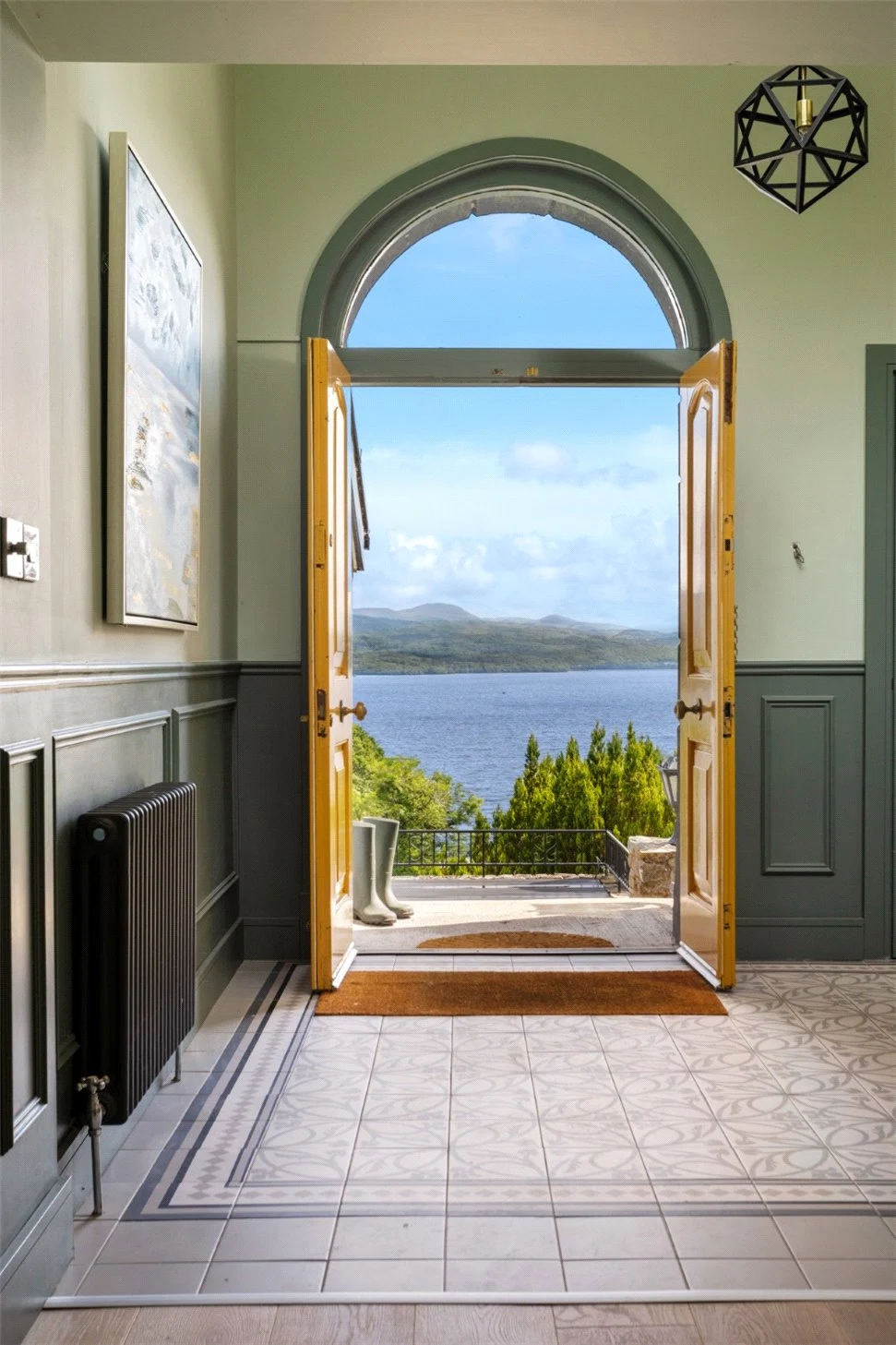 Down a small flight of steps is the living space, a show stopping double-height space with views over the Lough. Panelling that runs from the kitchen through to this room helps the large space feel cohesive, while also adding character. The living room also leads out to an outdoor terrace, perfect for enjoying the views in good weather.