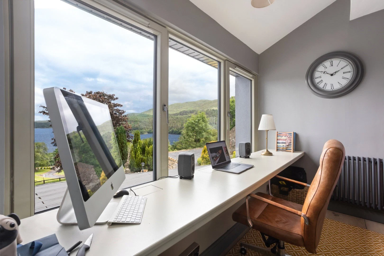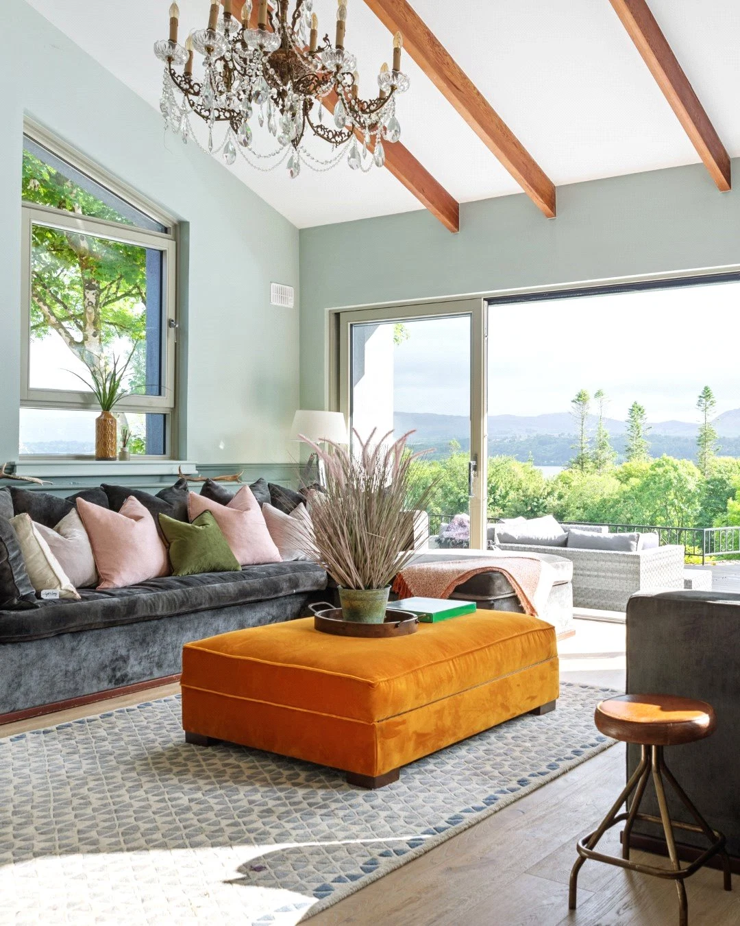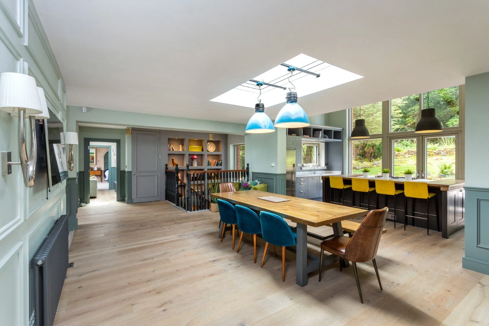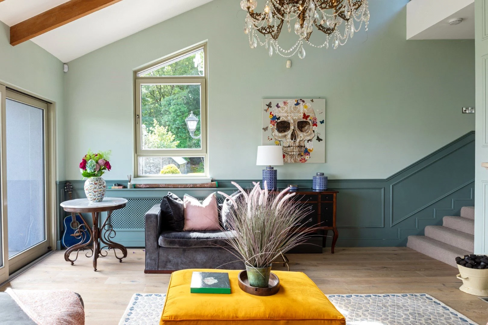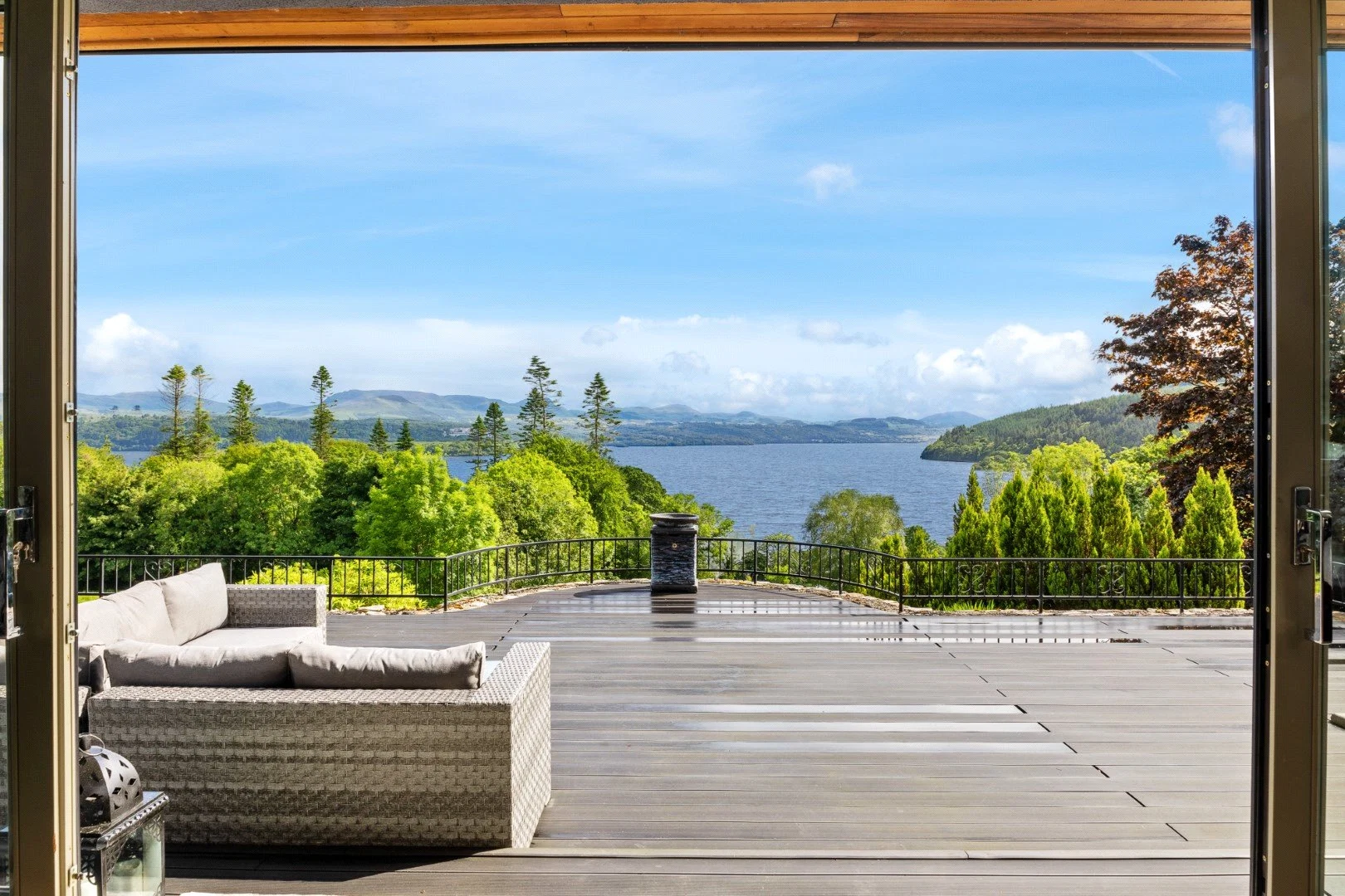Down a small flight of steps is the living space, a show stopping double-height space with views over the Lough. Panelling that runs from the kitchen through to this room helps the large space feel cohesive, while also adding character. The living room also leads out to an outdoor terrace, perfect for enjoying the views in good weather.